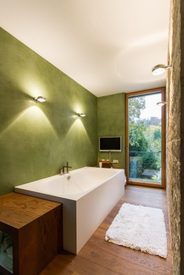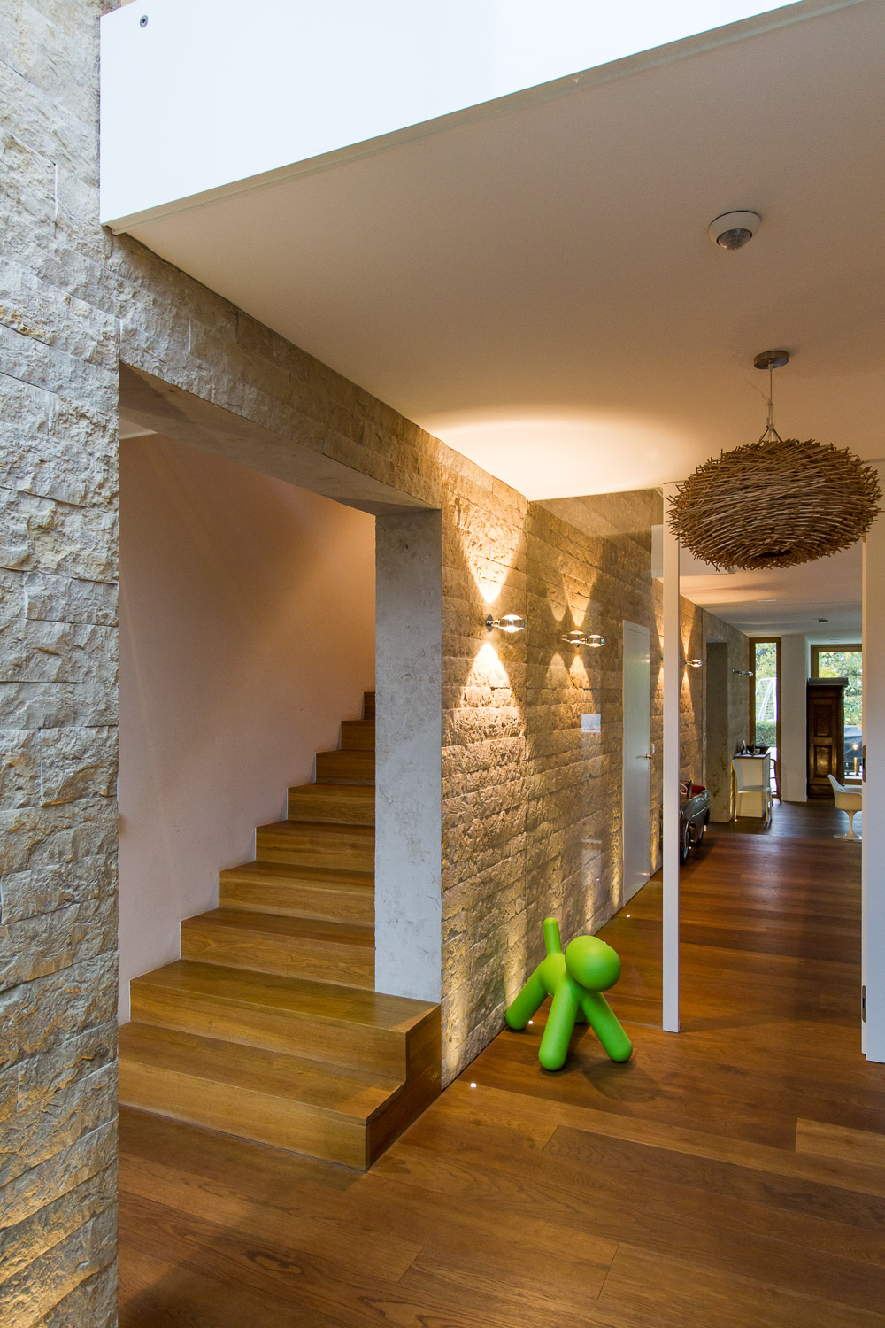 Prägendes Element ist eine längs durch das gesamte Haus verlaufende Natursteinwand, die die Trennung zwischen Wohn- und Nebenräumen bildet.