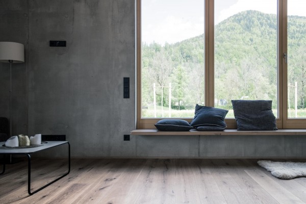 Das innenräumliche Konzept wird von einem starken Kontrast zwischen oberer und unterer Etage geprägt: Während im offenen und durchlässigen Erdgeschoss Sichtbeton und große Fensteröffnungen dominieren, sind im Dachgeschoss kleine Räume und Holzoberflächen vorherrschend.