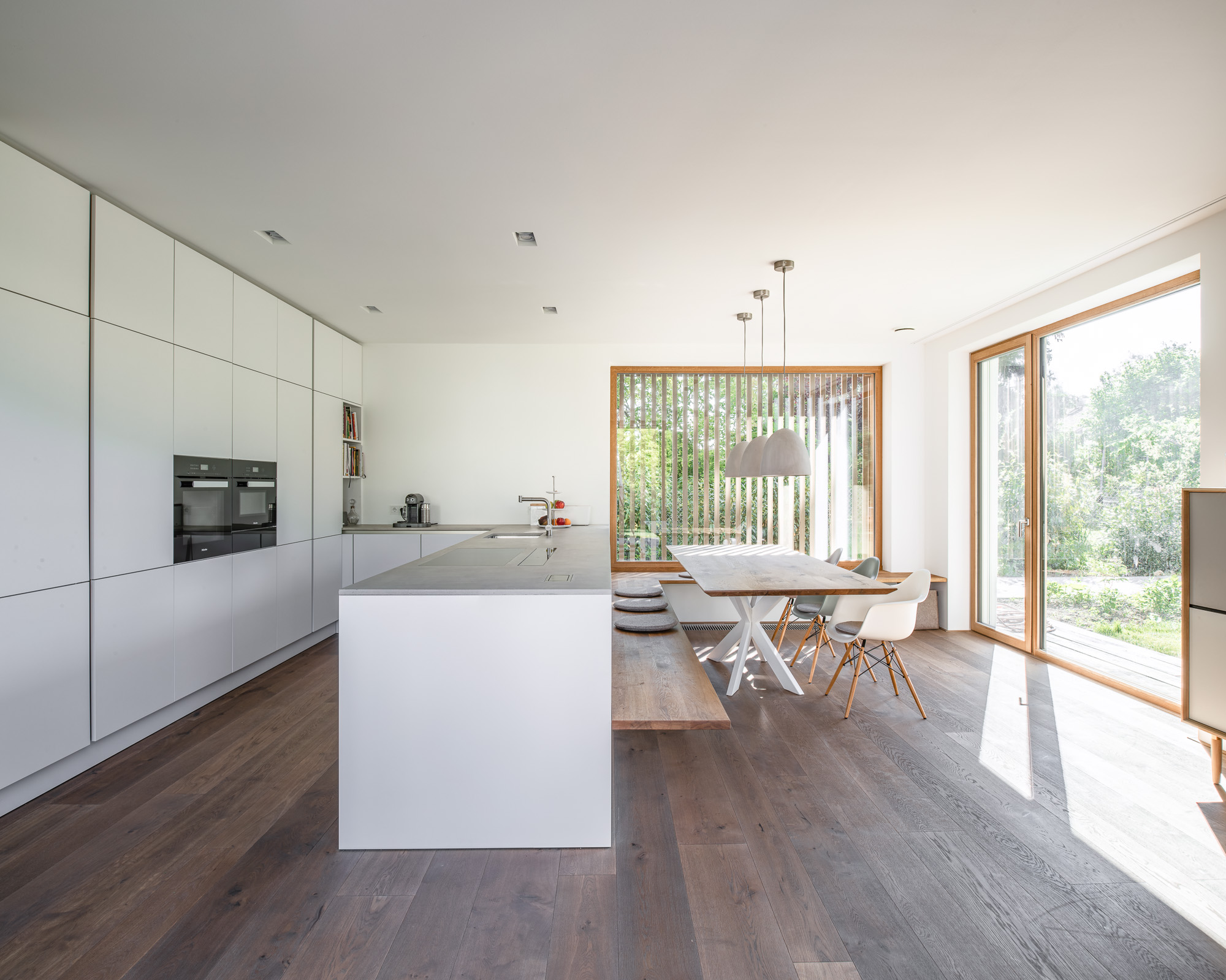 Großflächige Verglasungen in den Eckbereichen der zueinander versetzten Gebäudehälften lassen Blickbeziehungen zwischen den halboffenen Räumen entstehen. Eine weit zu öffnende Fassade lässt den Innenraum schwellenlos in den Außenraum fließen. Die Küche und das Wohnzimmer sind so über die Hauptterrasse im Südwesten zu einem Raumgefüge verbunden. Dieser besondere Bereich profitiert von einer alten, erhaltenen Kiefer, die ihn rahmt und eine angenehme Hofsituation erzeugt.