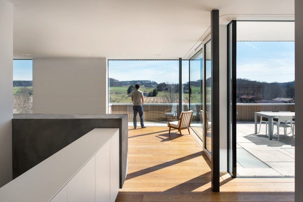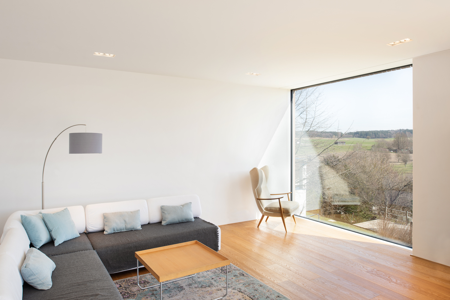 Den Bauherren stand für ihr Bauvorhaben ein traumhaftes Hanggrundstück in Weßling zur Verfügung. Das Zweifamilienhaus ist so in den Südhang gestaffelt, dass alle Räume direkten Zugang zum Garten oder zu Dachterrassen haben und durch großflächige Verglasungen vom Panorama über die weite Voralpenlandschaft profitieren.