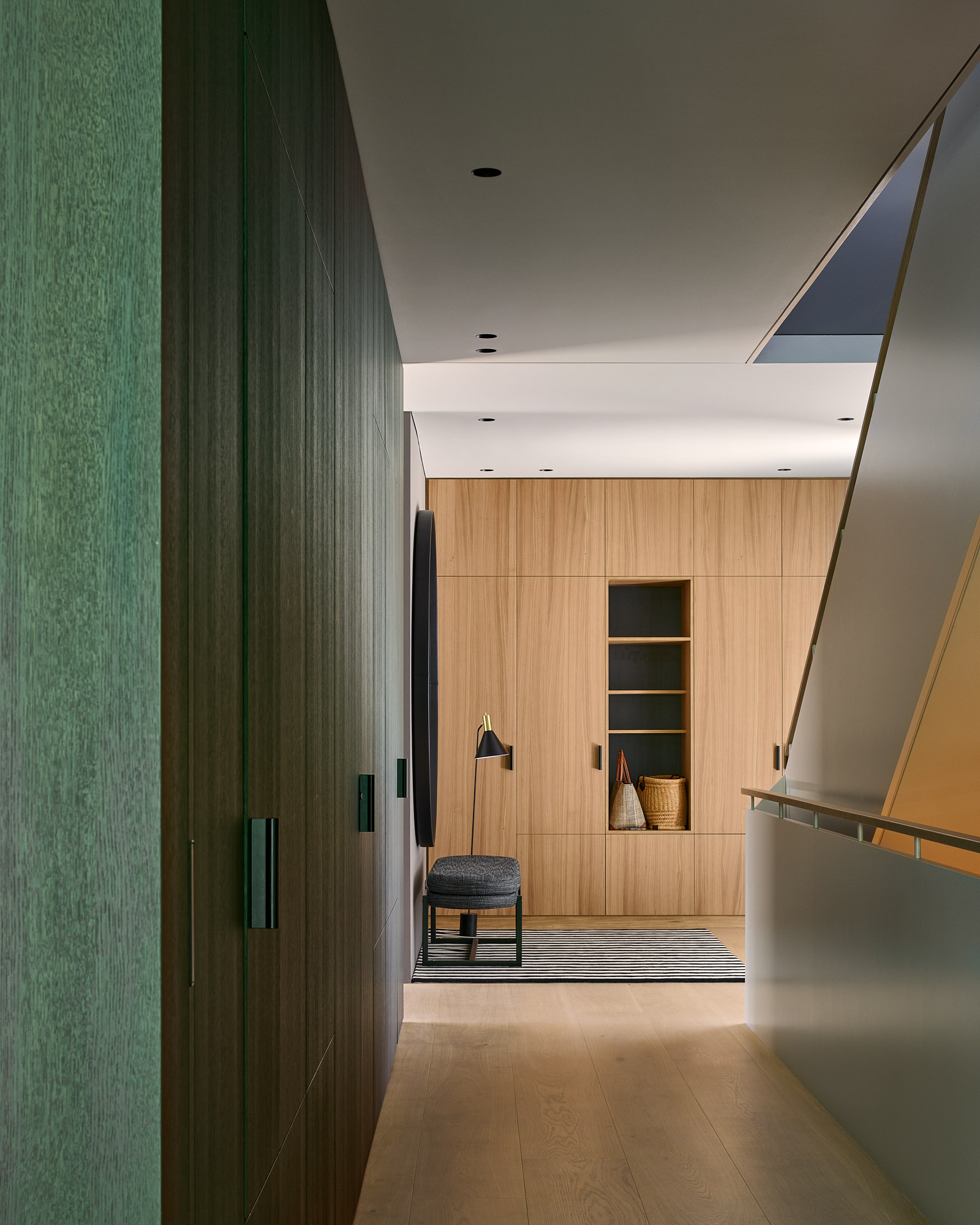 Im Erdgeschoss ist eine offene, lichte Raumabfolge aus öffentlichem und privatem Ankommen, Arbeiten, Kochen, Essen und Wohnen um einen freistehenden Kubus angeordnet. Dieser grün gebeizte hölzerne Kern beherbergt unterschiedliche Funktionen, die beinahe unsichtbar integriert sind und die jeweils benachbarten Nutzungszonen erweitern: Der Kücheninsel gegenüber bietet er Raum für Anrichte, Küchengeräte und Stauraum, dem Essbereich gegenüber eine Ausstellungswand für Kunst. Zum Erschließungsflur hin reihen sich als detailreich gestaltete Schrankwand getarnt weitere Nebenräume und ein Aufzug aneinander.