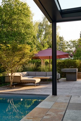 Der Pool ist das zentrale Element innerhalb der „Innenhofsituation", die das Wohngebäude mit seiner überdachten Terrasse zusammen mit dem Poolhaus und dessen vorgelagerten Sonnendeck mit der gegenüberliegenden Außenküche aufspannt. An diesen Bereich schließen weitläufige natürliche Gartenflächen mit großem Pflanzenreichtum, Sträuchern und Beeten an. So laden die verschiedenen Sitz- und Liegemöglichkeiten, teils sonnig, teils wind- und wettergeschützt, das ganze Jahr zur vielseitigen Nutzung des Außenbereichs ein.