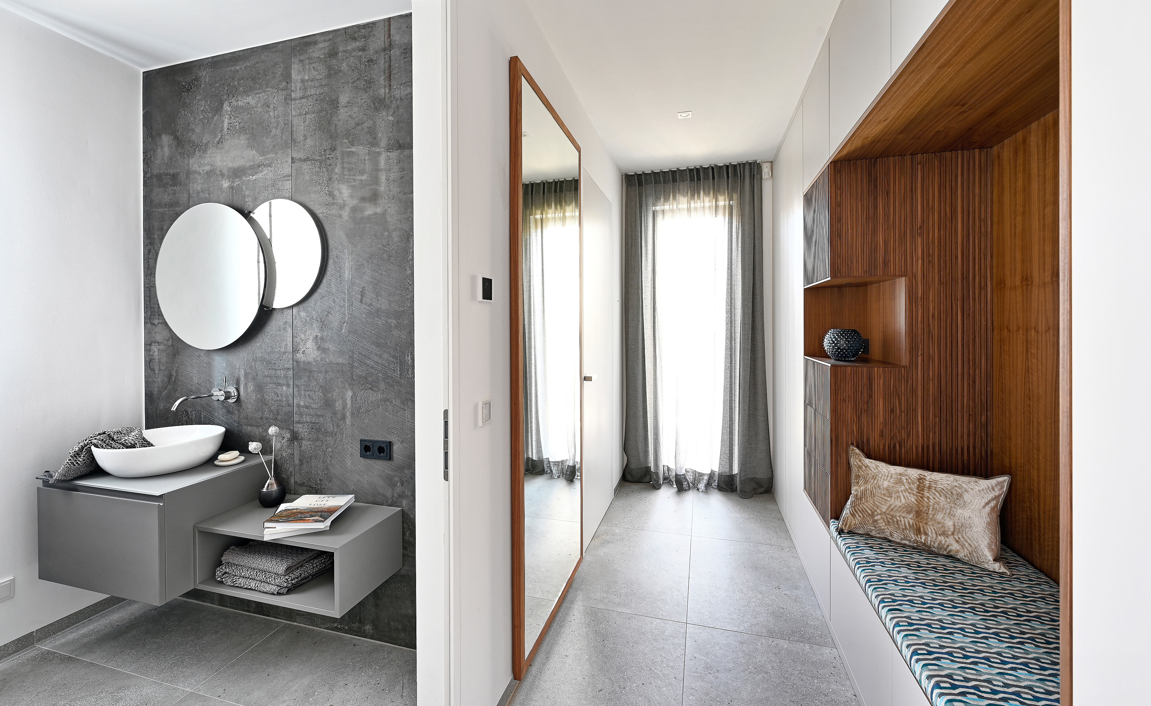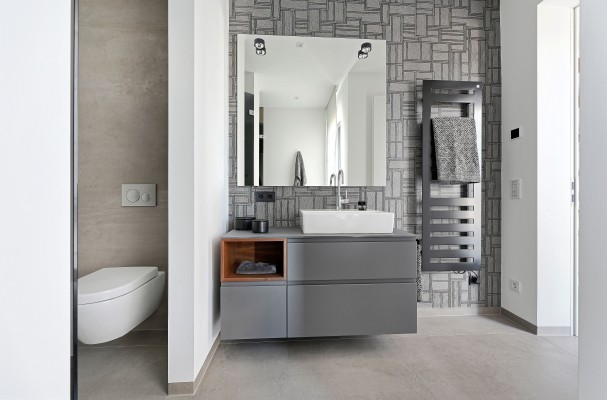 Die Bäder sollten schlicht und zeitlos gehalten werden. Sie sind mit individuell angefertigten Schränken und Einbauten ausgestattet und bestechen durch ihre hochwertigen Oberflächen sowie Details, wie Grifffugen oder indirekter Beleuchtung.