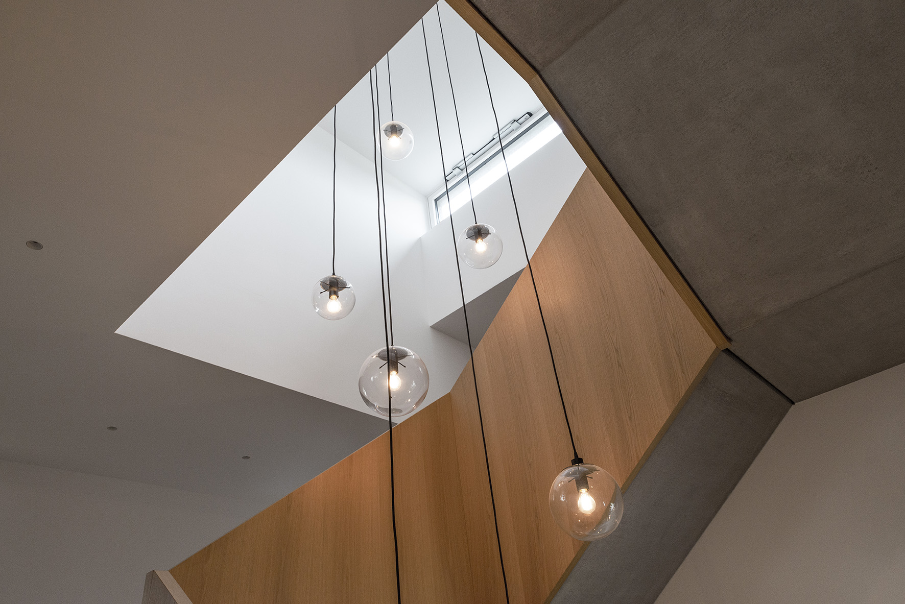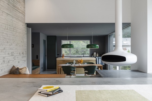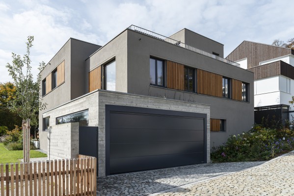 Auf einem leicht geneigten Hanggrundstück entstand ein großzügiges Einfamilienhaus mit Doppelgarage. Zentrales Element im Treppenhaus ist eine bis zu 4 Meter hohe Sichtbetonwand. Die im Zentrum des Hauses angeordnete Treppe aus eingefärbten Sichtbetonfertigteilen führt über insgesamt 7 Levels vom Keller bis ins Dachgeschoß.