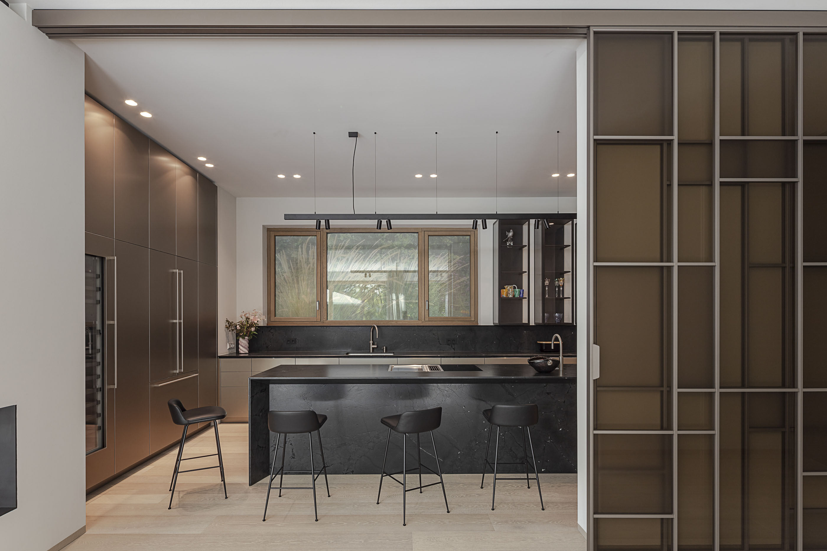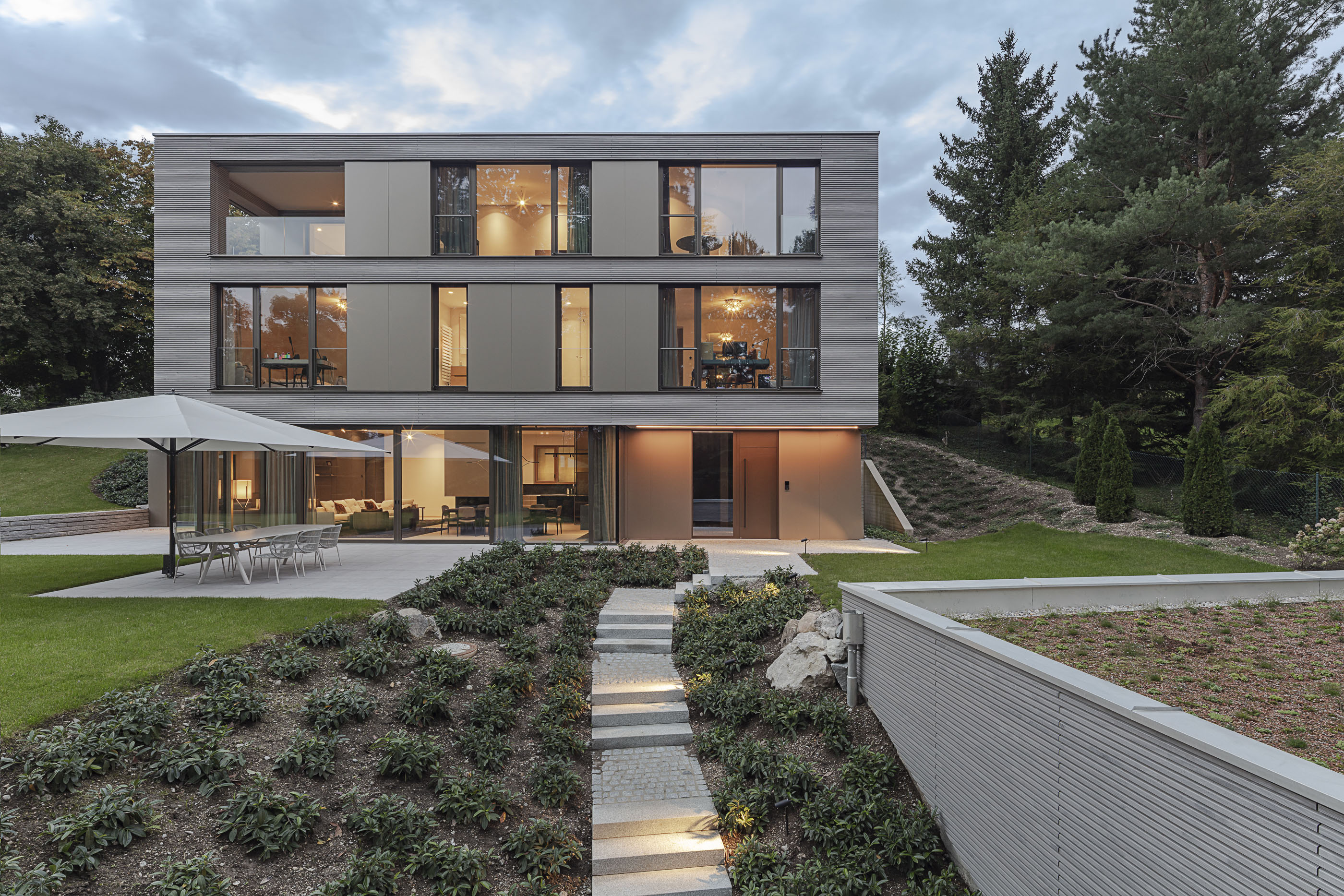 Durch die Fassadengestaltung mit eleganten, horizontalen Holzlamellen aus lasierter Weißtanne, fügt sich das Haus unprätentiös in die durch die großen Bäume geprägte Umgebung ein. Die feinen Ausführungsdetails der Fassaden mit Ecken und Fensteröffnungen auf Gehrung zusammengefügt, verraten die Materialität nicht sofort und erzeugen zusammen mit den unsichtbar befestigten Aluminium Paneelen eine sehr hochwertige und elegante Ausstrahlung.
