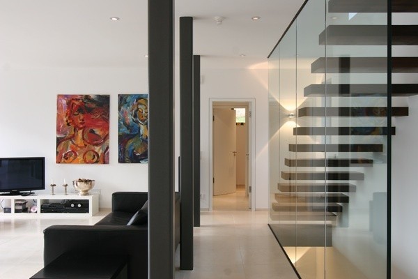 Über die freikragende Massivholztreppe aus gedämpfter Robinie gelangt man in das Obergeschoß mit seinen Privatbereichen. Der Gäste- und Wellness-Bereich mit einem vorgelagerten blickgeschütztem Terrassenhof befindet sich im Souterrain.