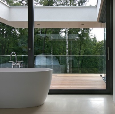Das Haus ist nach Süden großflächig verglast. Der Ausblick auf die umgebende Parklandschaft und den Starnberger See ist in jedem Raum des Hauses erlebbar. Alle Wohn- und Schlafräume lassen sich mit Schiebefenstertüren zu den vorgelagerten Balkonen und Terrassenflächen hin öffnen.