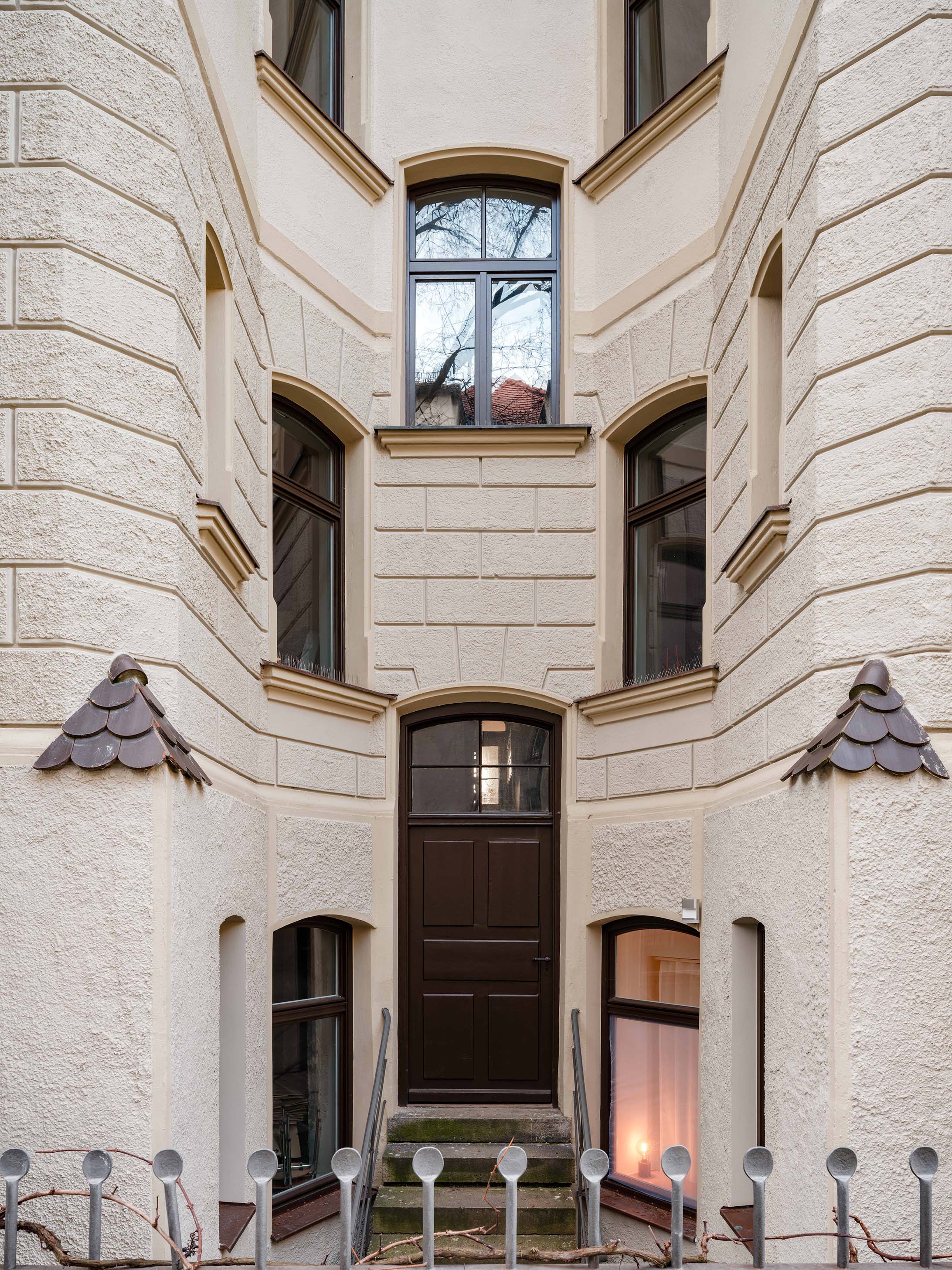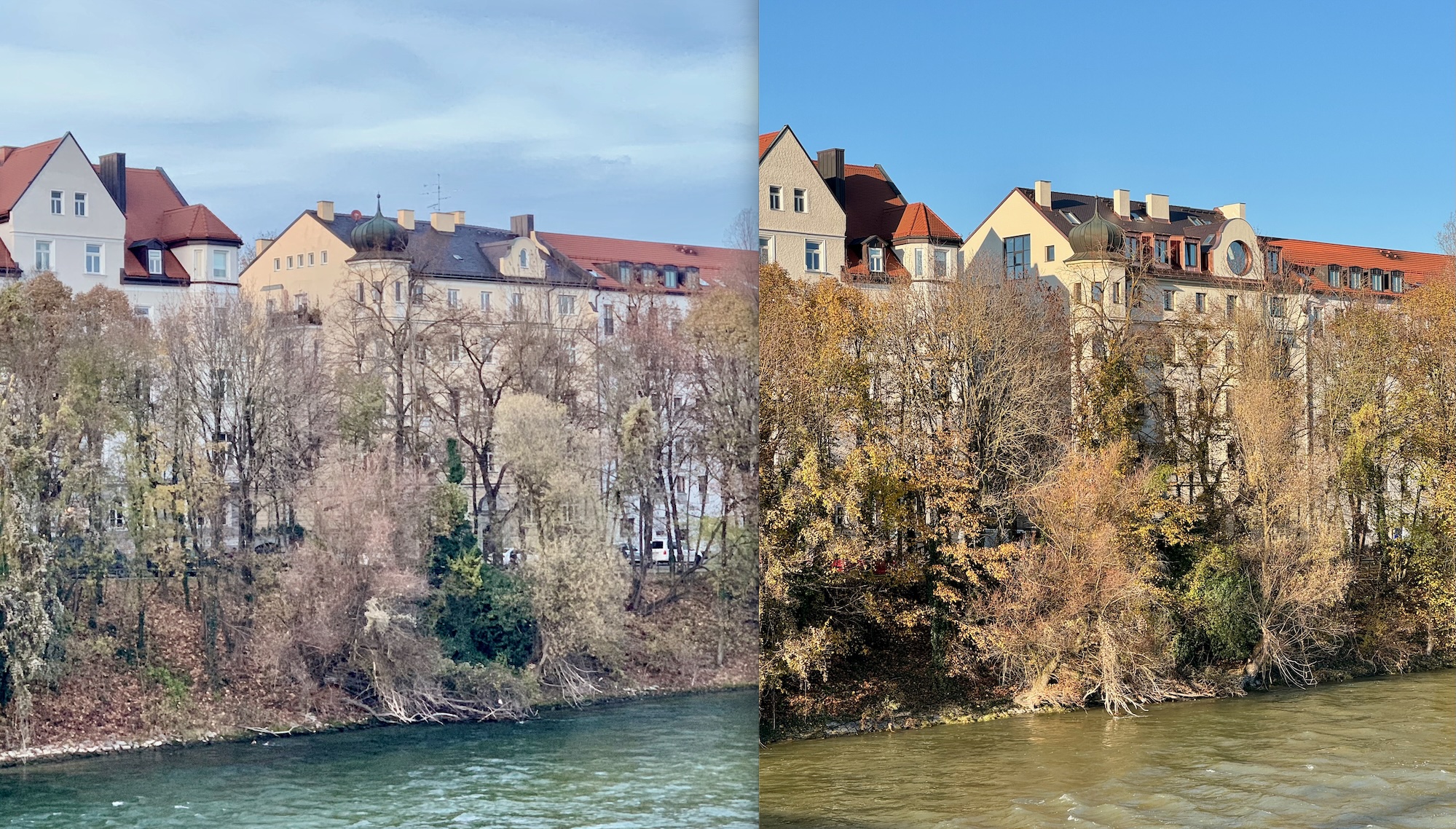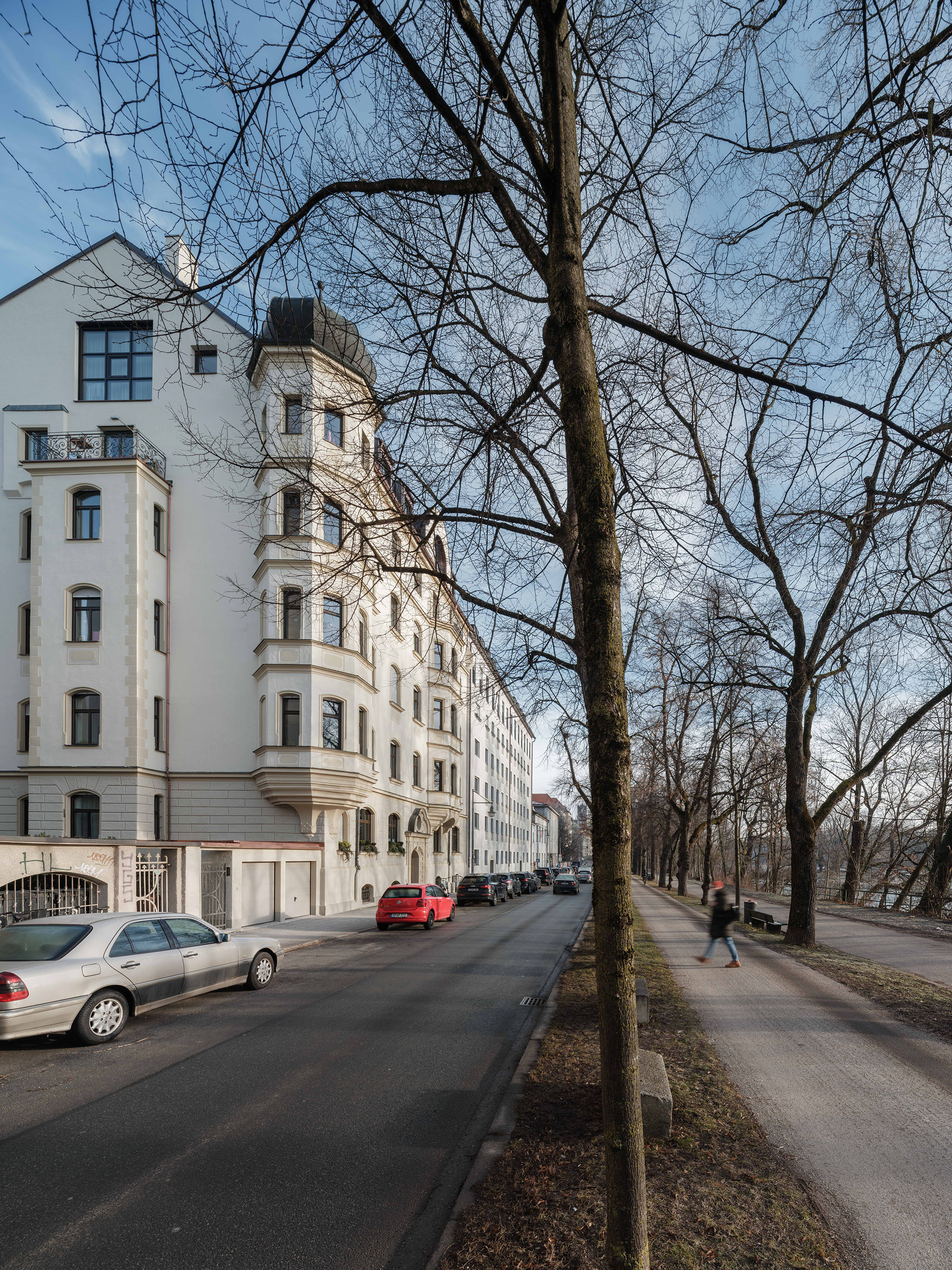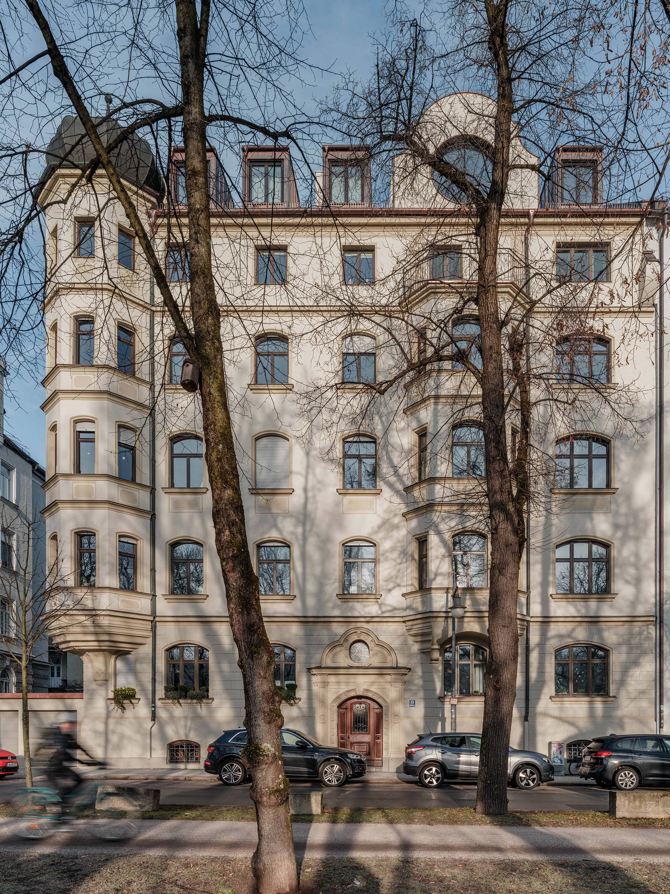 Das Einzeldenkmal, direkt an der Isar gelegen und 1889 erbaut, befand sich historisch gesehen nicht mehr im Originalzustand. Durch einen Brandschaden war das Dach in den 1950er-Jahren stark vereinfacht neu aufgesetzt worden. Das Konzept der nun abgeschlossenen Sanierung sah zum einen vor, die Dachform anzupassen, um die Proportionen des Hauses zu verbessern. Zum anderen wurde die Fassade in enger Abstimmung mit dem Denkmalamt entsprechend dem historischen Befund saniert. Die verschiedenen Sanierungsschritte wurden an der Fassade sichtbar und ablesbar gemacht: 1889, 1953, 2023 ... So ließ sich die Geschichte eines nicht in allen Bereichen denkmalgeschützten Hauses nachverfolgen und zu einem stimmigen Gesamtkonzept zusammenfügen.