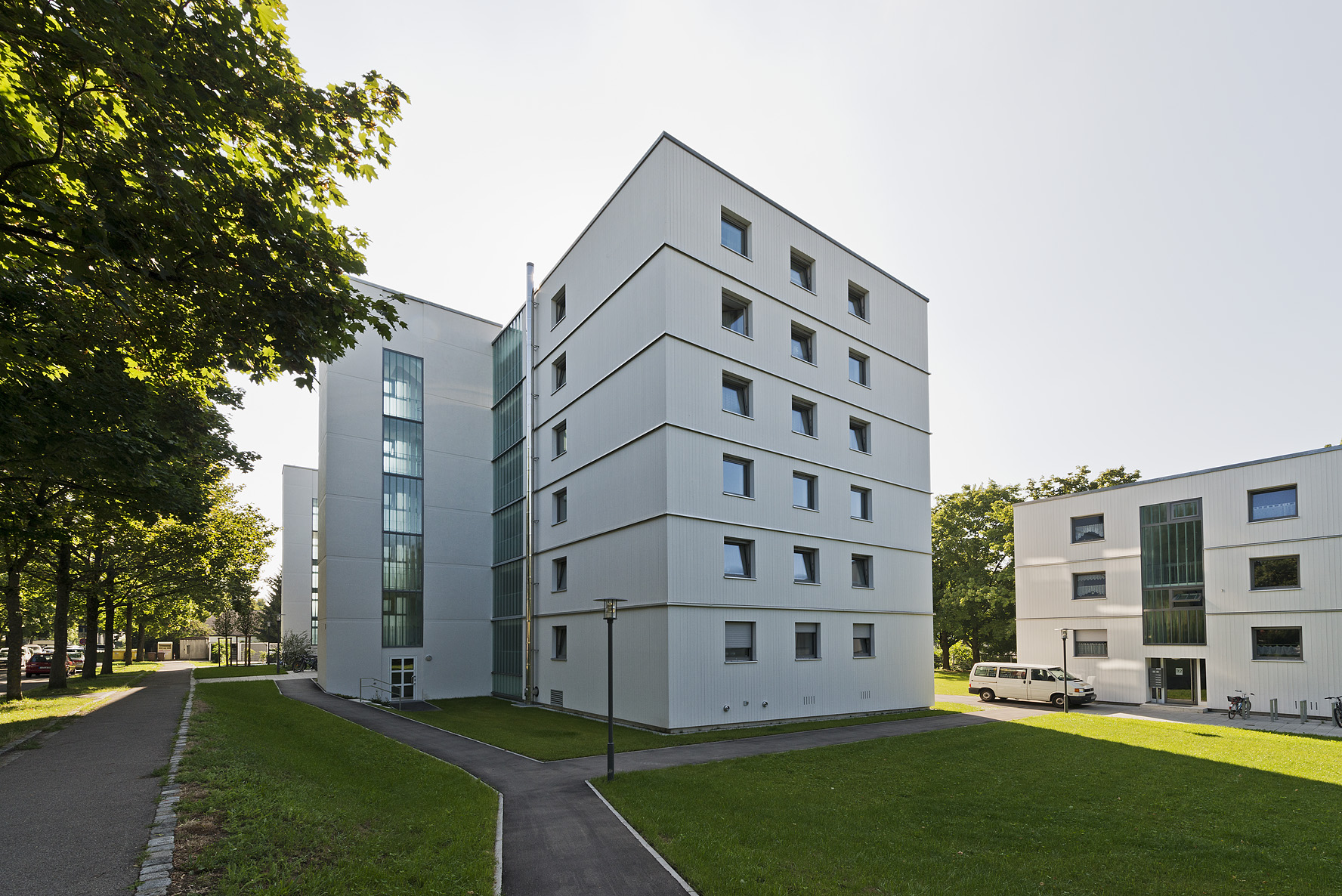Die bestehende Wohnanlage der WBG in der Grüntenstraße in Augsburg wurde im Rahmen des Modellvorhabens der Obersten Baubehörde „e% - Energieeffizienter Wohnungsbau" modernisiert und gefördert.