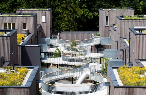Für dieses Projekt – ein Baulos der größten Holzbausiedlung Deutschlands – hatten die Planer ein ganz besonderes Konzept entwickelt: Um den Austausch zwischen den Bewohnern zu fördern und um Kosten zu sparen, wurden neben den maßgeschneiderten Wohnräumen ein Gemeinschaftsraum, ein Gästeappartement, eine Werkstatt, Gemeinschaftsgärten und ein Toberaum für Kinder geplant. Die Architekten - agmm Architekten und Stadtplaner mit Hable Architekten - entwickelten einen spannenden Entwurf mit vielen Grünflächen, einem zentralen, geschwungenen Laubengang als Zugang zu den Obergeschossen und einer durchgehenden, senkrechten Holzverschalung der Fassaden.