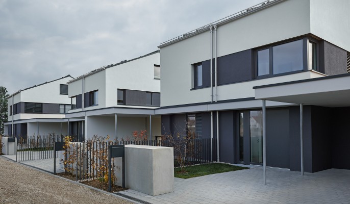 Klare Linien und die Gestaltung der Fassaden im Kontrast von weißen und anthrazitfarbenen Putzflächen vermitteln eine moderne Architektursprache.