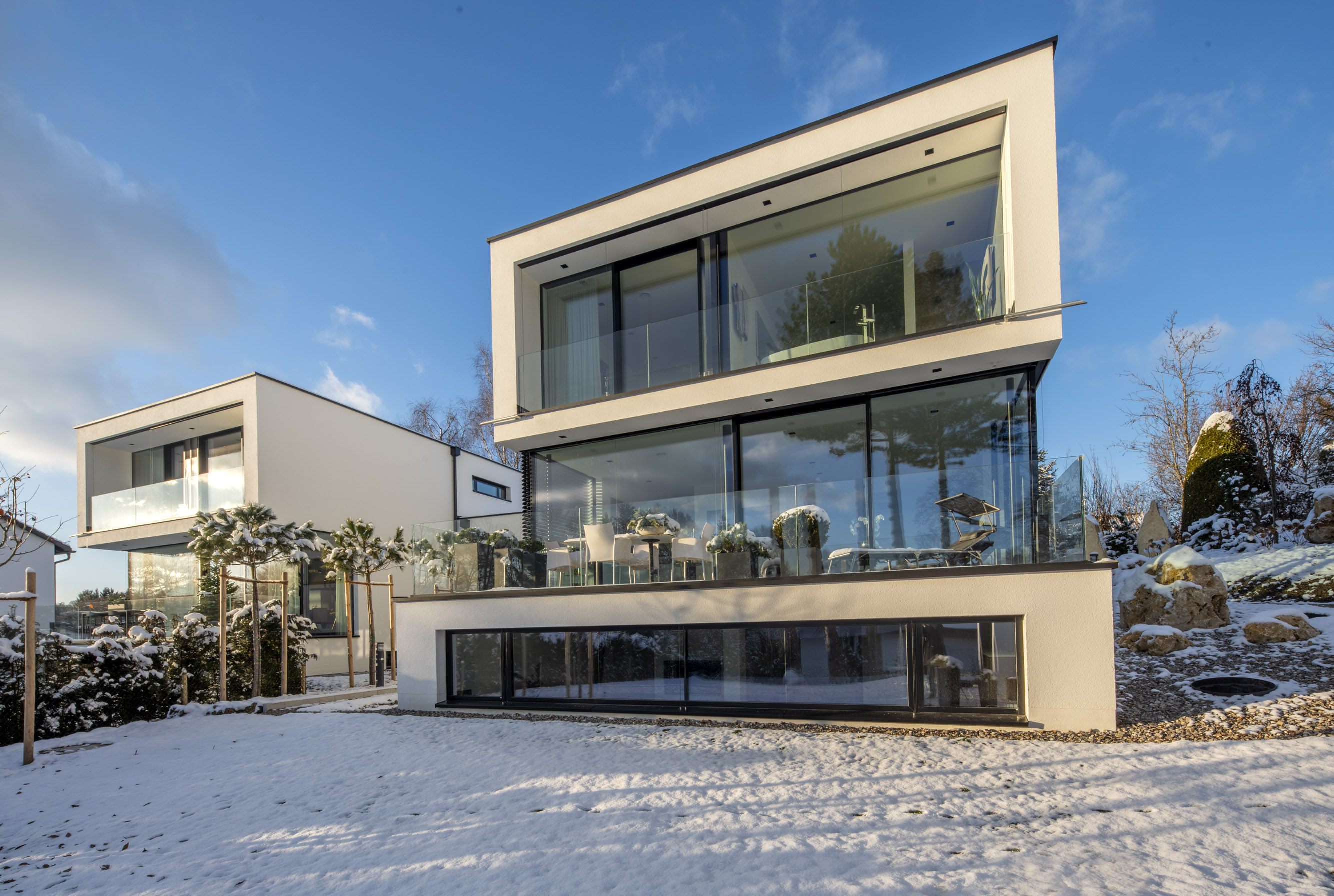 Sogar die beiden Häuser selbst staffeln sich in ihrer Höhenlage und passen sich so harmonisch dem Gelände an. Die innenseitigen Fassaden der beiden Gebäude halten sich eher geschlossen, um die wechselseitigen Blicke ein wenig auszublenden. Zu den Seiten und nach vorne hingegen öffnen sich die Fassaden großzügig zur Natur. Die jeweiligen Obergeschosse richten ihren Blick wie ein Bilderrahmen Richtung Starnberger See.