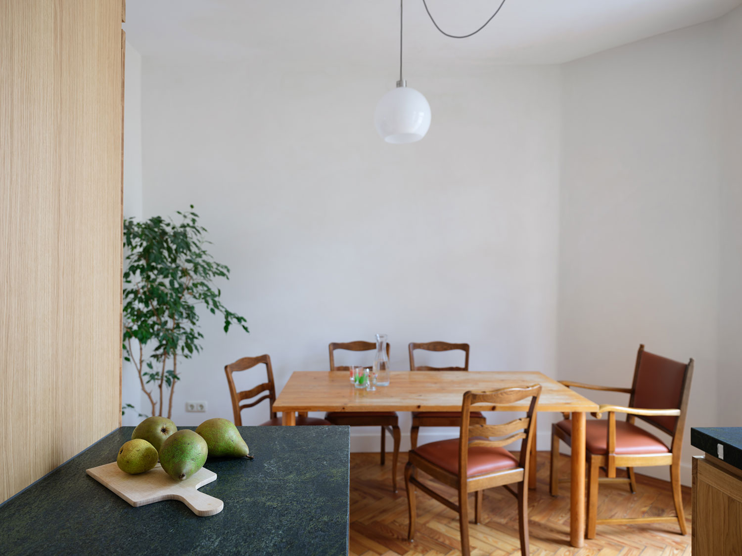Der historische Charme blieb dabei erhalten: Das freigelegte Fischgrätparkett aus Kiefer wurde restauriert und ergänzt, wo nötig. Eine Wandheizung anstelle eines Heizkörpers schafft zusätzlichen Platz, während Lehmputz an den Wänden für ein gesundes Raumklima und seidigen Glanz sorgt. Die handgefertigten Fronten aus geölter Eiche ziehen sich als klare Linie durch die gesamte Einrichtung.