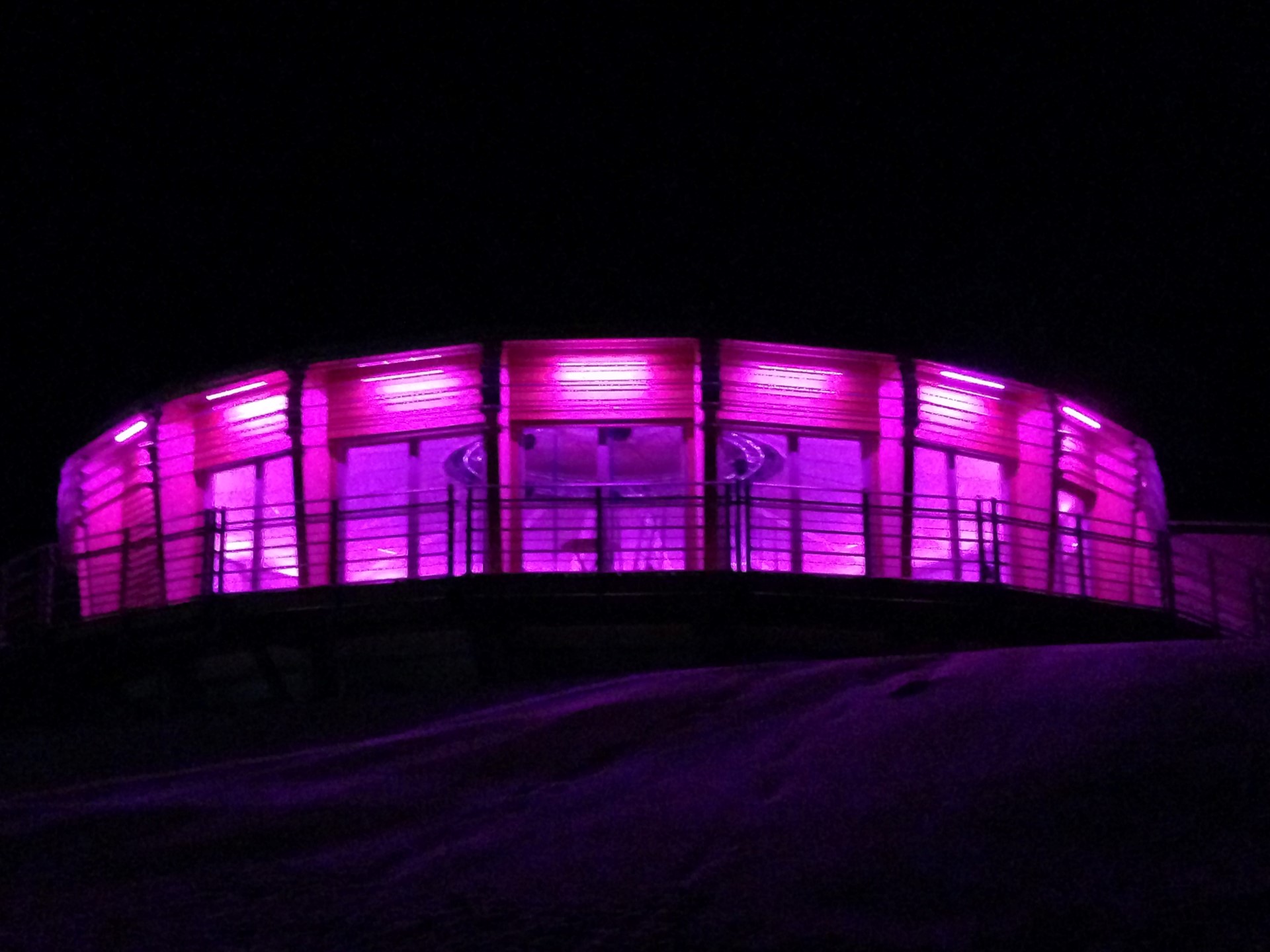 1.500 LEDs und 16 Millionen Farben sorgen dafür, dass die Gebäudehülle in allen erdenklichen Farben erstrahlt. Der Multifunktionsraum für Bewegungstraining liegt oberhalb des Eisstadions und ist mit einer illuminierbaren Gebäudehülle umschlossen.