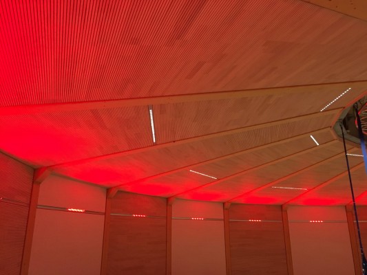 welche perfekt aufeinander abgestimmt wurden. Per Knopfdruck können acht hinterlegte Lichtszenen und individuelle Farben aufgerufen werden. Je nach Veranstaltung werden über die separat angesteuerten Raumanteile wie Decke, Wand und Fußboden sehr unterschiedliche Raumeindrücke geschaffen.