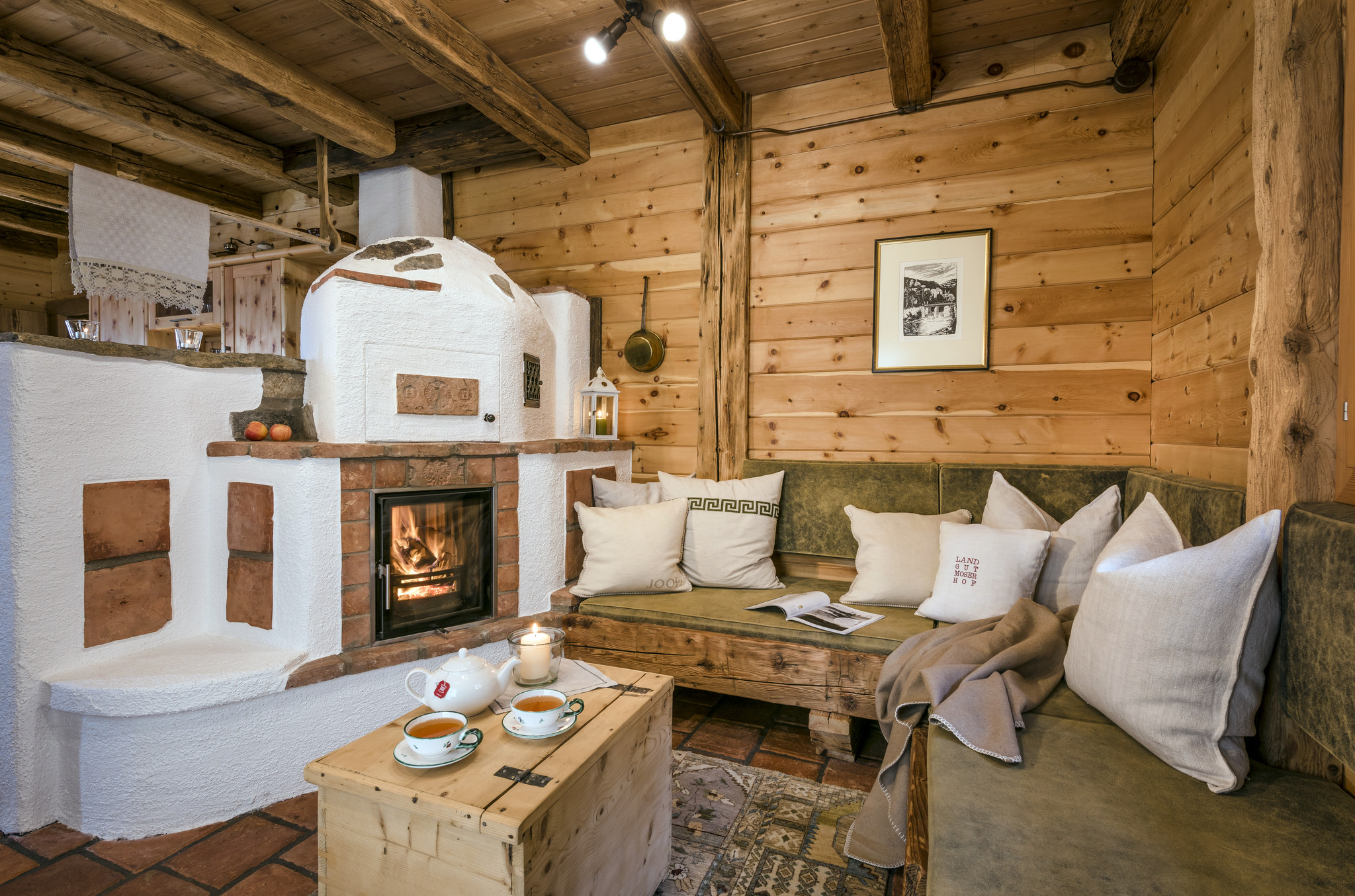 Außen ebenso wie innen dominiert Zirben- und Almlärchenvollholz, das aus den eigenen Wäldern des Moserhofs stammt. Außerdem wurde Jahrhunderte altes Alt-Holz integriert; alle Vollholzmöbel hat der Hotelinhaber Heinz Hartweger in seiner Werkstatt selbst entworfen und gebaut. Weitere biologische Materialien wie Hanf, Schafwolle, Terracotta und Filz komplettieren die Einrichtung der Wohnküche, die in eine Stube mit offenem Kamin und Sitzecke übergeht. Ein extra Badehaus mit frei stehender Wanne, Holzofen und einer zur Talseite verglasten Sauna mit Blick auf die Gipfel der Reißeckgruppe ist ein herrlicher Luxus hier oben; danach kült man im Natur-Badeteich ab und genießt beim Ruhen den Duft des Heulagers im Spitzboden.
