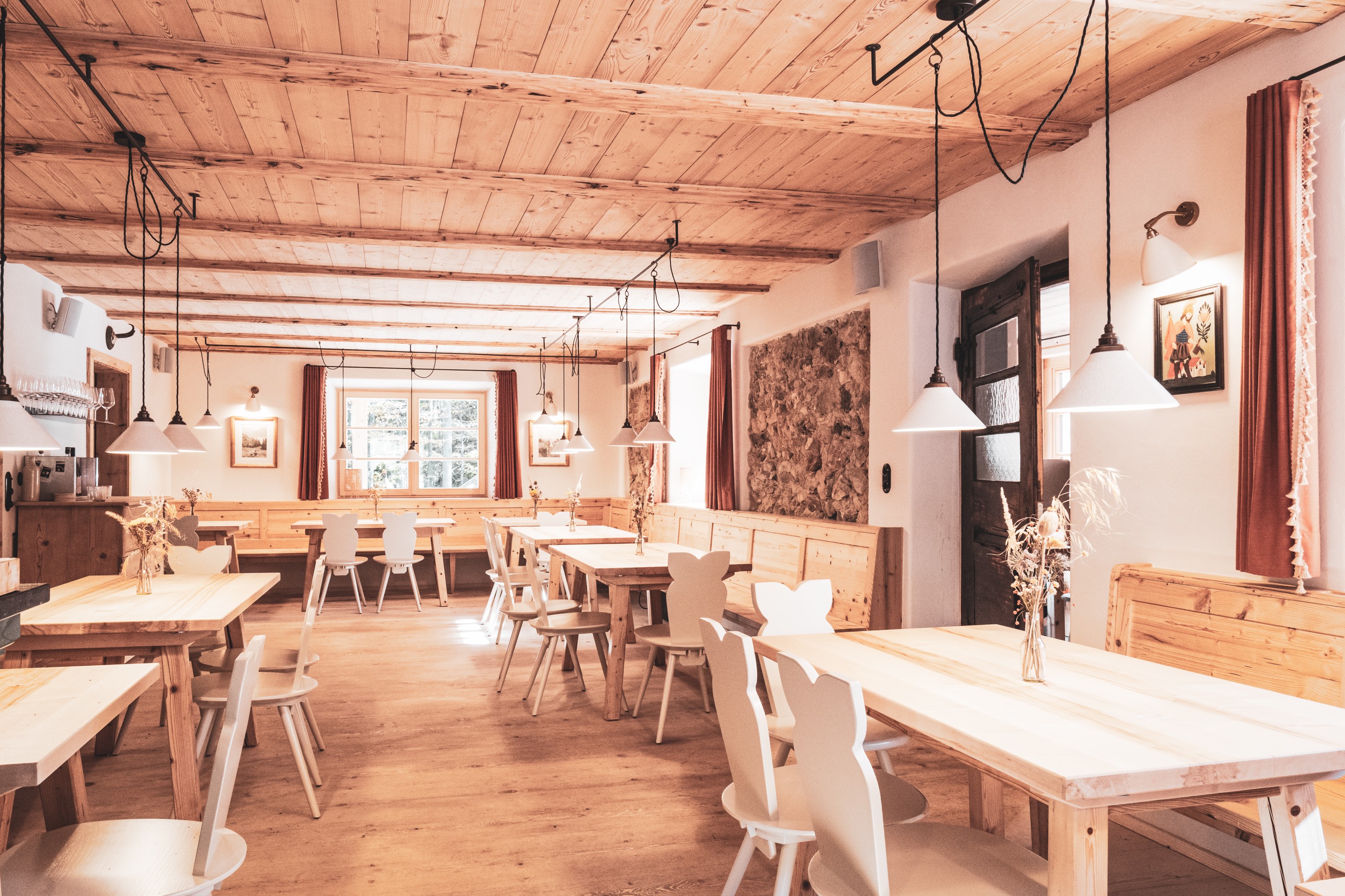 Inspiriert haben uns die Besonderheiten des Ortes, der Jahreszeiten, der vorhandenen Architektur, der Gemeinschaft, den dahinterstehenden Geschichten (von der Essensherstellung, über die Traditionen, die Menschen, bis zu den Speisen). Ziel war es, das gastronomische Konzept von radikal lokalen Speisen auch in der Architektur und Innenraumgestaltung widerspiegeln zu lassen. So wurden ausschließlich lokale Handwerker engagiert, welche mit regionalen Ressourcen die ehemalige Schutzhütte in ein neues atemberaubendes Ausflugsziel verwandelt haben.
