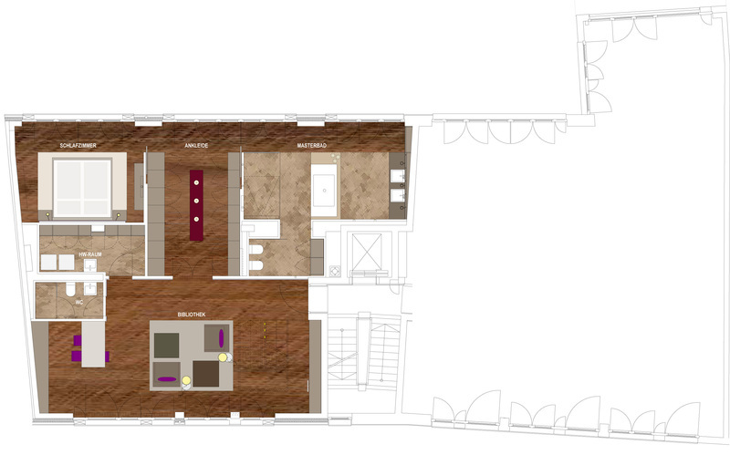 Der raumbildende Ausbau der Maisonette-Wohnung im 5. und 6. Obergeschoss verleiht mit dunklen, geölter Räuchereiche und warmtonigem, gelbem Juramarmor der Wohnung eine behagliche Eleganz. Textile Wandverkleidungen in einem matten Mauve -Ton begleiten Flure und Bewegungsflächen. Sie verbinden die beiden Ebenen zu einer formalen Einheit und schaffen auch in den sehr hohen Dachgeschossräumen eine wohnliche Raumakustik.