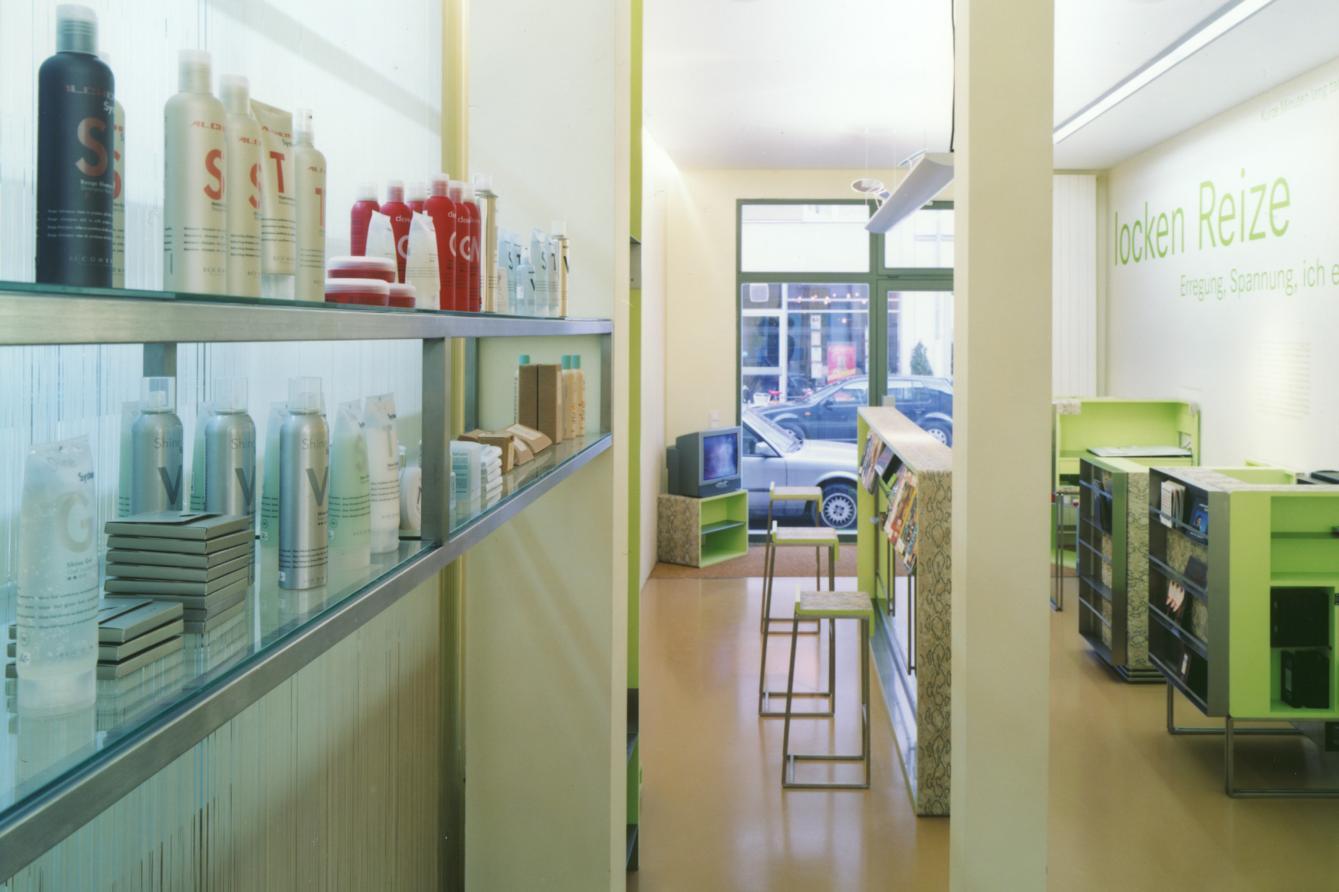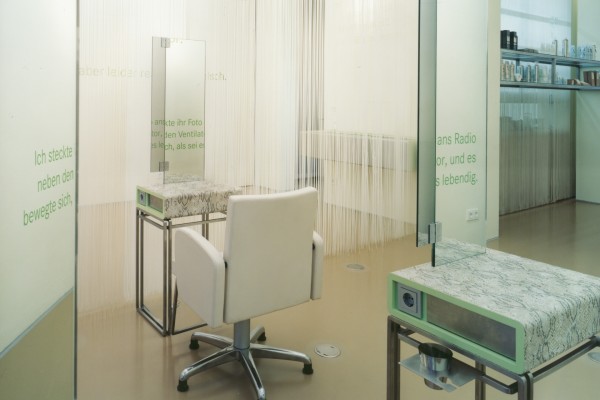 Textfragmente aus Lyrik und Kurzgeschichten an den Wänden, klassische Verwandlungsthemen aus der Natur gestalterisch interpretiert, leuchtende Farben besetzen die Wände und geprägtes Schlangenleder stülpt sich über die Möblierung - das Friseurgeschäft spielt bewusst mit der räumlichen Wahrnehmung der aus der Situation entstehenden assoziativen Bildern.