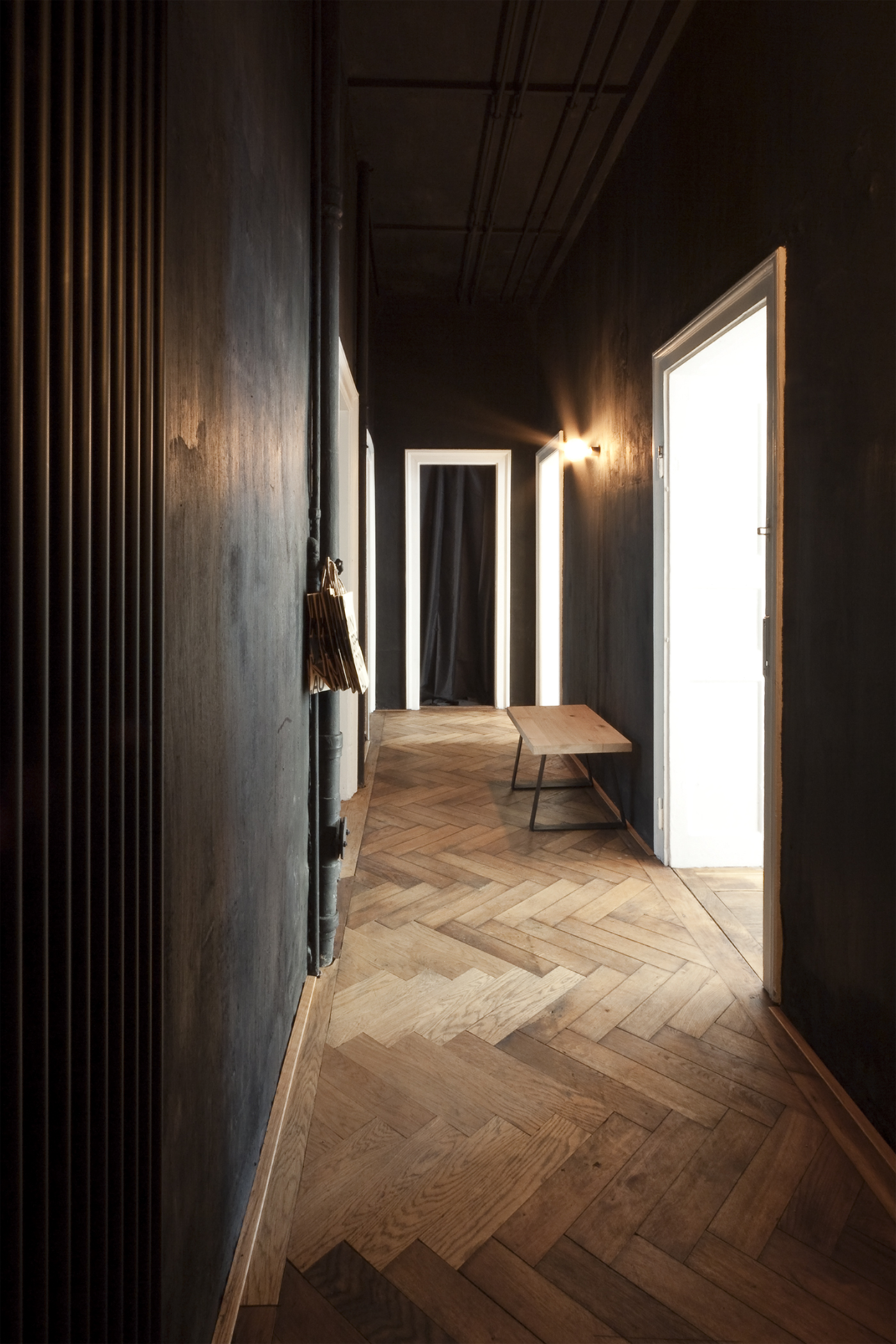 Die klare architektonische Sprache in Form von linearen und grafischen Elementen steht im Kontrast zu den lebendigen und ehrlichen Oberflächen. Ein wiederentdecktes Holzparkett und offengelegtes Sichtmauerwerk zeigen einen behutsamen Umgang mit dem Bestand.