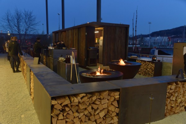 Durch holzgefüllte Stahlgestelle und Bambuskübel abgetrennte aber offen begehbare Bereiche, mit wenig Kies gefüllt, bieten Besuchern mit Fellen und Decken belegte Sitzplätze um lodernde Flammen in den Feuerringen. Hier gibt es die Möglichkeit zum Ausruhen, Wärmen, Entspannen, Genießen.