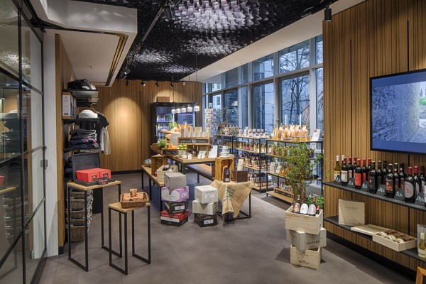 Ein Frische-Store wird ergänzt durch einzelne, frei im Raum inszenierte offene Cubes. Im Holzrelief der Wände sind verdeckt Schienen für ein multifunktionales Ladenbausystem integriert, ebenso wie eine digitale Anbindung für die unterschiedlichsten Nutzungen.