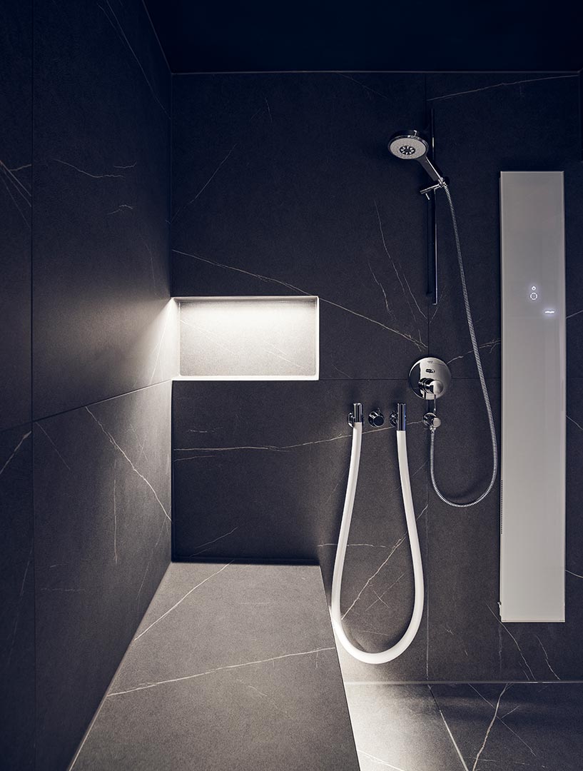 Neben Holz wurde vor allem Feinsteinzeug für eine natürliche Haptik verwendet. Ein modernes gestalterisches Gegengewicht bilden schwarze Leuchten und Armaturen sowie die geradlinigen Stahl-Glas-Elemente.