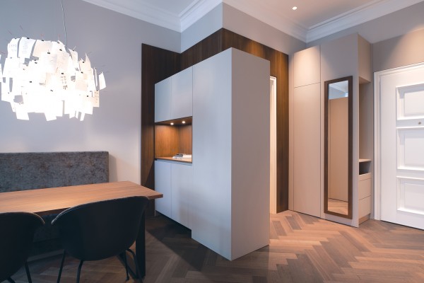 Das Apartment sollte über alle relevanten Funktionsbereiche verfügen. Es wird gekocht, gegessen, geschlafen, gechillt und fern gesehen. Da es sich um eine Zweitwohnung für Geschäftsreisen handelt, sollte genügend Stauraum vorhanden sein. Im Wohnbereich wurde eine funktionale und ästhetisch ansprechende Schlafcouch gewünscht.