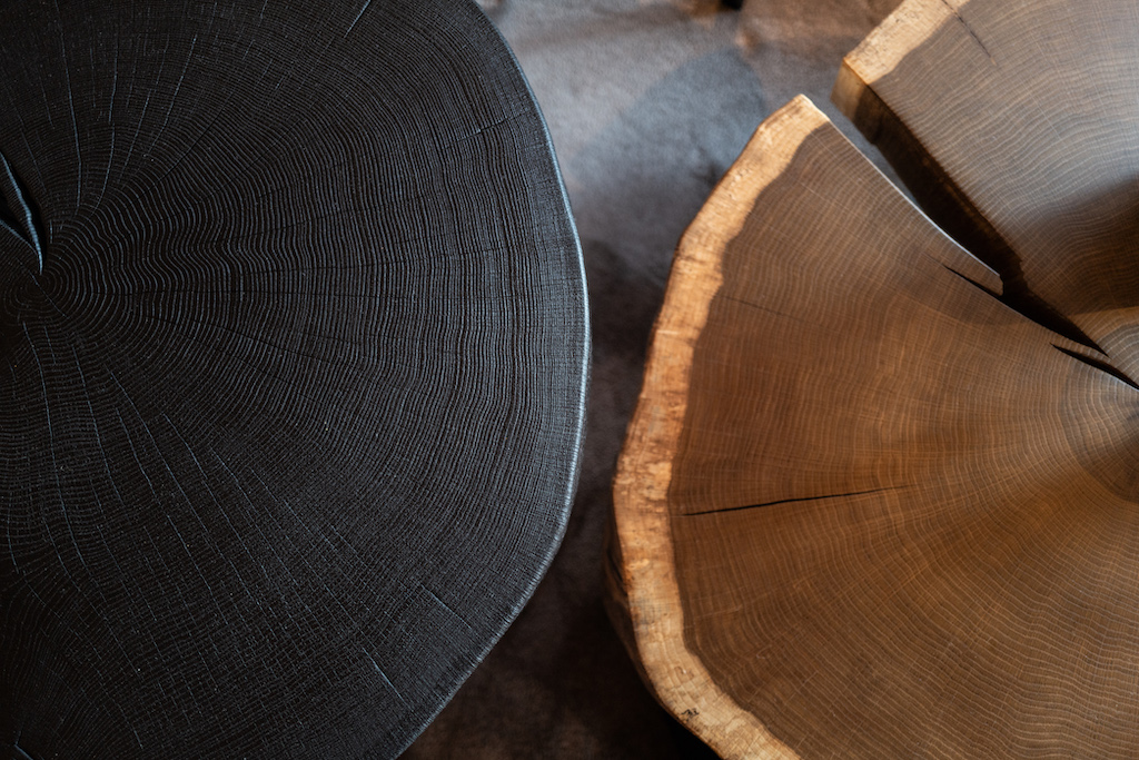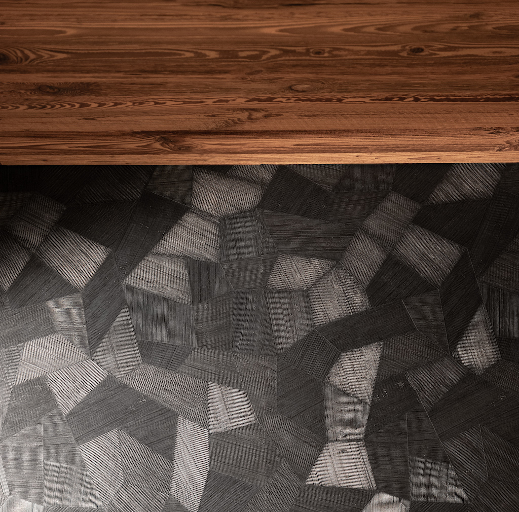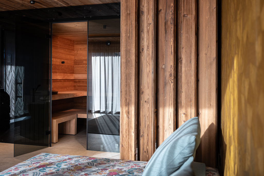 Nahezu zwei Drittel der Möblierung bestehen aus maßgefertigten Einbauten der hauseigenen Wetscher-Werkstätten. Die Kombination aus Altholz und dunkler Esche erzeugt haptische und optische Kontraste. Vom Entree über den offenen Dachstuhl bis hin zu den Schlafräumen prägt präzises Tischlerhandwerk das Erscheinungsbild und sorgt für eine strukturierte Raumnutzung.