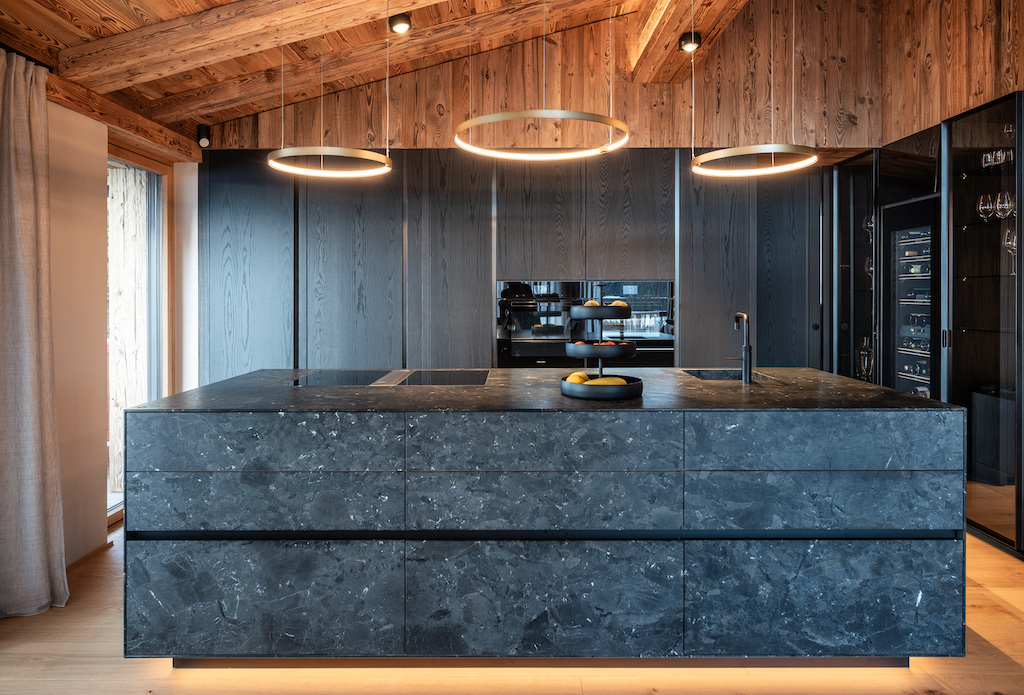Bereits im Eingangsbereich setzen ein temperierter Weinkubus und Kunstobjekte Akzente. Die Küche ist als offener Bereich mit zentralem Block konzipiert, während eine flächenbündig integrierte Hinterküche die funktionalen Arbeitsabläufe dezent auslagert.
