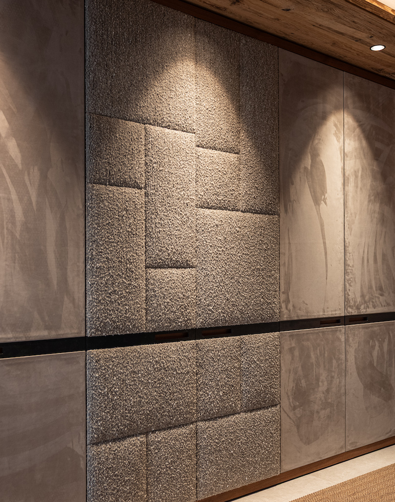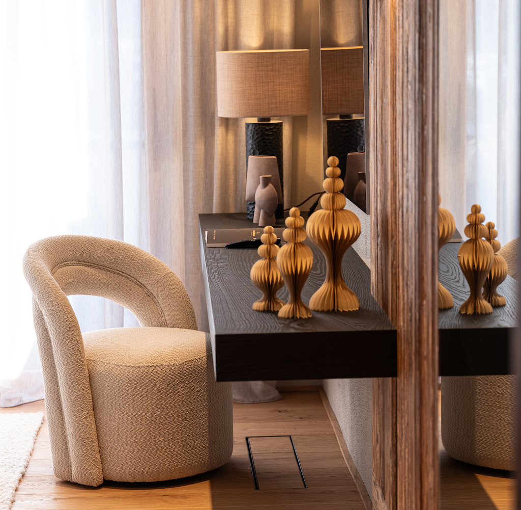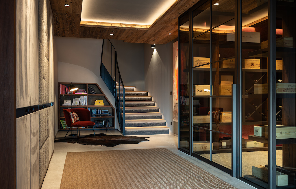 Während der Kunde an seinem Hauptwohnsitz modern lebt, sollte dieses Haus regionale Bezüge aufweisen – jedoch ohne rustikale Klischees. Die Neuinterpretation des alpinen Stils setzt auf Feingefühl: Holz, ausgesuchte Textilien und eine harmonische Farbpalette schaffen eine warme Atmosphäre und eine optimierte Raumakustik.