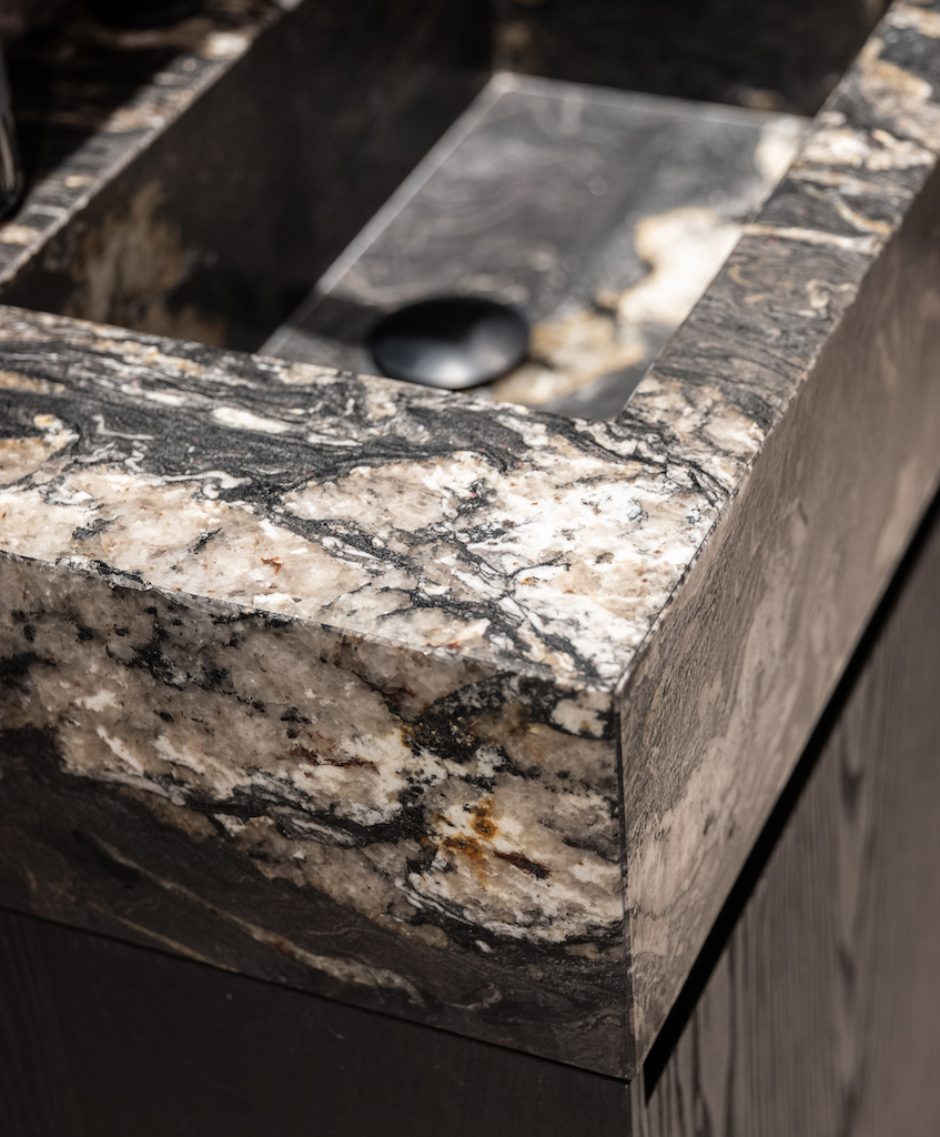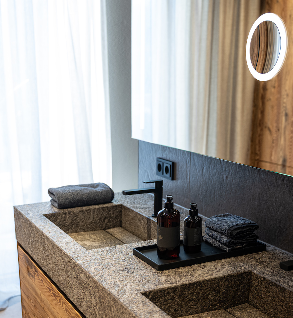 Das Materialkonzept vereint Naturstein, Holz, Tapeten und gepolsterte Wandverkleidungen. Ein Beispiel für die handwerkliche Detailtiefe ist das Natursteinbecken auf dem exakt abgestimmten Holzunterschrank. Textilien wie zarte Vorhänge und regionale Akzente durch Felle und Kissen sorgen für Geborgenheit, während großzügige Glasflächen den Bezug zum Panorama halten.