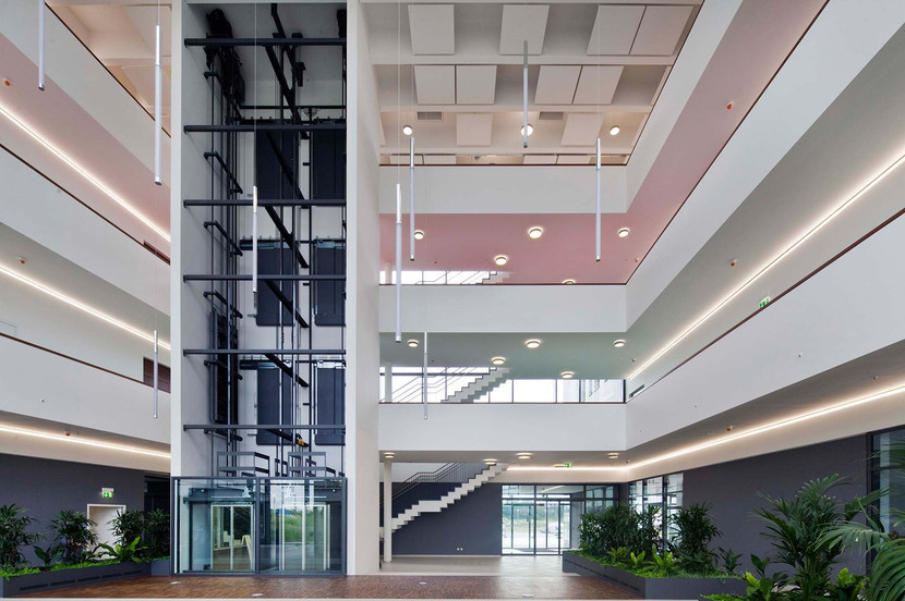 Das Erschließungskonzept über Galerien ermöglicht wie auch die entsprechende technische Vorrüstung eine flexible Grundrissaufteilung der Praxen. So können verschiedenste Fachbereiche wie Radiologie, Onkologie oder auch Eingriffsräume integriert werden. Das offene Atrium dient zur leichten Orientierung und Auffindbarkeit der Praxen, als Ort der Begegnung und mit einem Café im Erdgeschoss als Treffpunkt und Wartebereich. Dabei unterstützen die großflächigen Verglasungen den Bezug von Innen nach Außen.