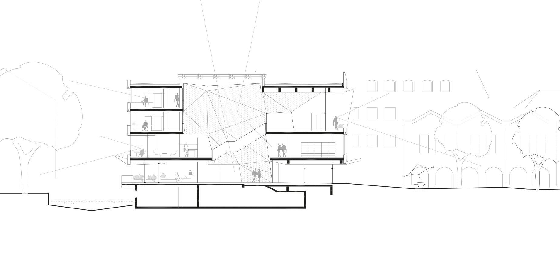 Der helle Granit des Marienplatzes zieht sich in das Gebäudeinnere als ein öffentlicher Weg, der durch das Rathaus führt, gesäumt von Läden und einem Café. Er geht über in das mehrgeschossige Atrium, das die Nutzungen des Rathauses als fließender Raum für zufällige oder geplante Begegnungen verbindet. Stadtbücherei, Lesecafé, Bürgerservice, Trauzimmer, Büroräume und Sitzungssäle gliedern sich auf den einzelnen Ebenen an. Gleichzeitig wird durch das Atrium Tageslicht in das Innere des Hauses gebracht, gelenkt und reflektiert insbesondere von der nördlichen Atriumwand. Die skulpturalen Elemente der Wand setzen sich zu Brüstungen, Sitzbänken und Theken fort.