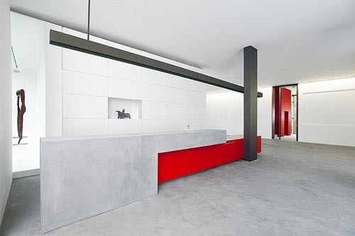 Die Betonwände und -decken sind nur mit einer hauchdünnen, naturweißen Schicht bedeckt, eine kreidige Oberfläche der organischen Handspachtelmasse, mit einer farblosen Lasur überzogen. Sie unterstreichen die vom wechselnden Tageslicht mit seinen Schatten geschaffene lebendige Struktur und verhindern Lichtreflexionen. Durch diese Wahrnehmung gewinnen die Räume an zusätzlicher Tiefe. Die homogenen Wand- und Deckenflächen, zusammen mit der durchgehenden Fläche des ebenfalls gespachtelten Bodens betonen die Strenge des Raums. Das besondere Raumerlebnis wird auch durch die Schärfe der Kanten, die sich präzise in den geplanten Schnittpunkten kreuzen, unterstützt. Möglich durch präzisen Ortbeton in allen Decken, Wänden und Oberlichten. Einzige markante Farbtupfer sind das quadratische, rote Eingangstor, gleichzeitig Markenzeichen des Museums, sowie der Aufzugskern im angegliederten transparenten Treppenhaus. Zwischen Innen und Außen besteht ein lebendiger Dialog: In den Öffnungen der Glasflächen und Vitrinen erscheinen die Grünflächen des Parks selbst wie Bilder im Raum, gleichzeitig erlebt der Spaziergänger von Außen Einblicke in das Gebäude.