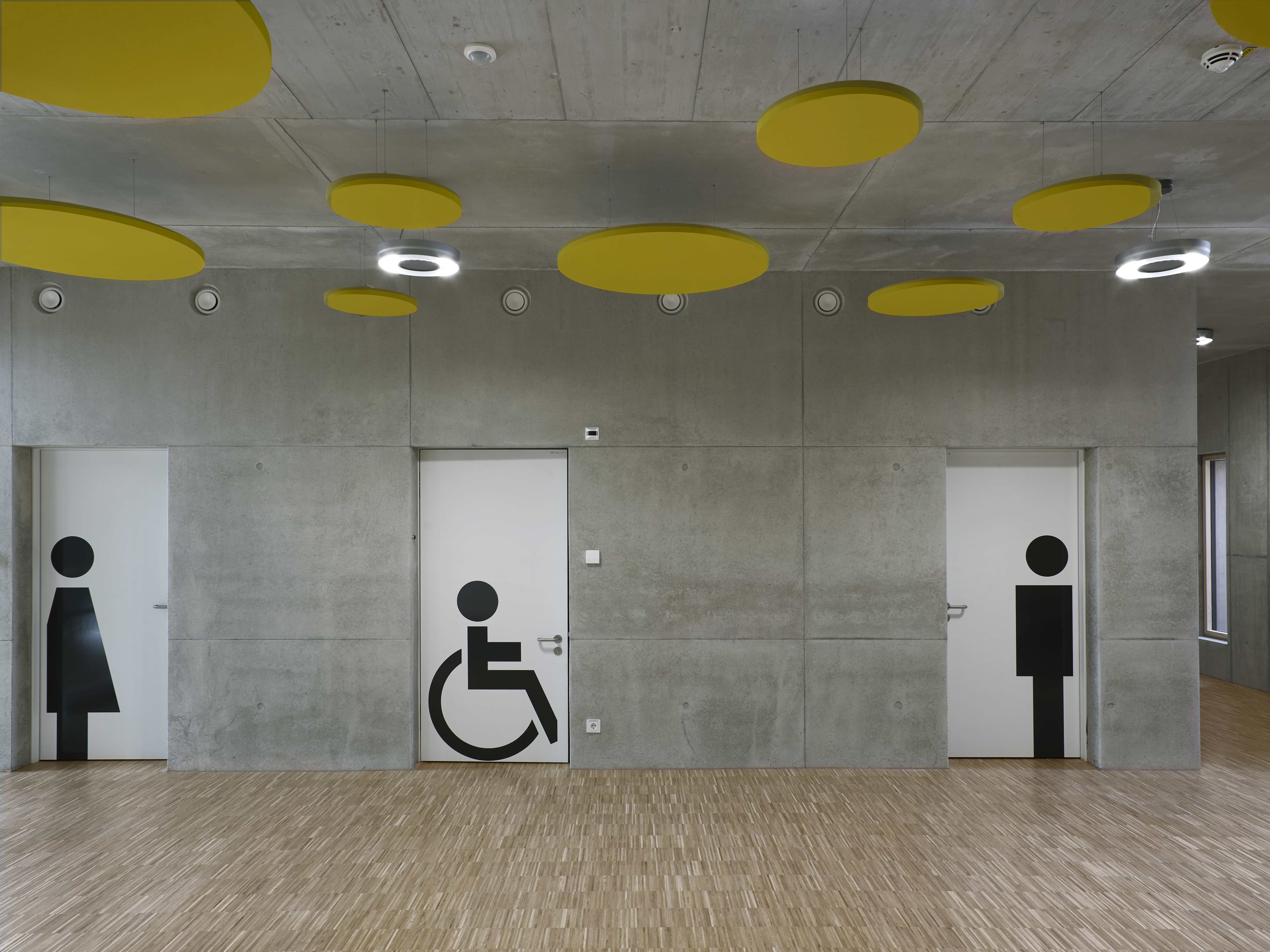 Der Erweiterungsbau ist analog zum Bestand in Massivbauweise erstellt. Im Innenbereich dominiert der in unterschiedlichen Oberflächen ausgeführte Sichtbeton. Die Zugänge zu den Klassen sowie die Garderobenelemente bilden einen warmen Kontrast aus natürlich lasiertem Fichte-Massivholz. Die Materialität der Flurwand setzt sich in den acht Klassen- und zwei Gruppenräumen fort, am Boden findet ein Wechsel von Eiche Industrieparkett zu Linoleum statt. Der Boden ist wie auch die Stuhl- und Tischgestelle in dunklem Anthrazit gehalten, die massiven Tischplatten und die farbigen Stuhlschalen scheinen so im Raum zu schweben. Die Natur belassenen Akustikdecken aus Holzwolleplatten runden den natürlichen Charakter mit ab.