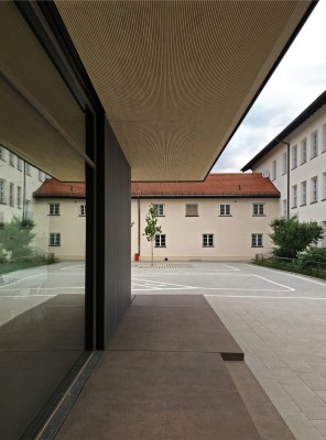 Der Neubau einer der ersten Grundschulmensen der Landeshauptstadt München ergänzt das unter Denkmalschutz stehende, auf einem teilweise bewaldeten Grundstück stehende Hauptgebäude von 1939 mit seinem Anbau von 1968. Das Raumprogramm sieht neben einer Mensa mit Küche für 300 Essen im Zweischichtbetrieb außerdem zwei Gruppenräume vor.