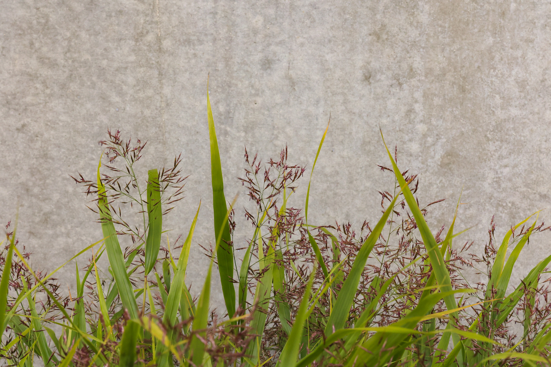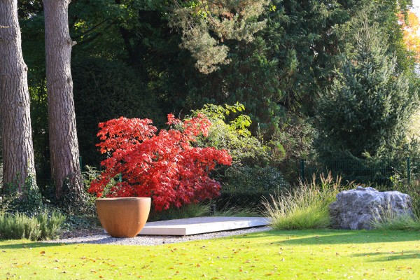 Im Herbst zeigt sich dieses modernes Gartenjuwel in voller Pracht. Rote und orange Laubfärbung der Fächer-Ahorne leuchtet in der Sonne. Die verschiedenen Ziergräser spielen mit ihrer Leichtigkeit vor den Sichtbetonwänden.
