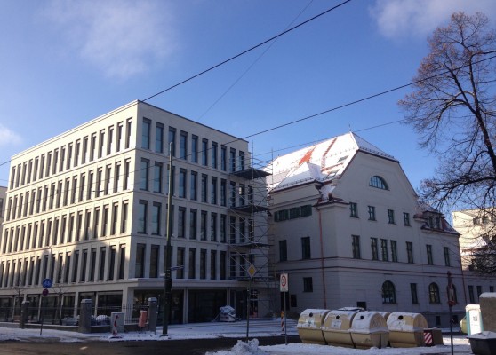 Laux Architekten planten eine Mischung aus hochwertigem Wohnen, Büro und ein paar Einzelhandelsflächen für die Hausbau. Dabei wurde die denkmalgeschützte ehemalige Fabrikantenvilla zu neuem Glanz gebracht. Das Areal liegt zwischen dem sog. Bürgermeistergarten und dem Parkgrundstück des Bundesfinanzhofs.