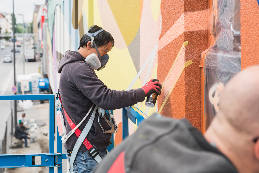 Ein 600 Quadratmeter großes Kunstwerk in München-Obersendling ist vollendet: Die Fassade des künftigen NYX Hotel Munich in der Hofmannstraße 2 wurde in nur drei Wochen von den international gefragten Street Art-Künstlern SatOne (Rafael Gerlach) und Daniel Man in ein abstraktes Gemälde verwandelt.