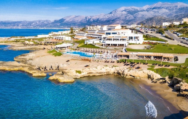 Bei dieser großzügigen terrassenförmig gebauten Anlage, haben alle Gäste einen Logenblick auf die Ägäis. Die sechs Restaurants und Bars verbinden griechisches Flair mit internationalem Spirit.