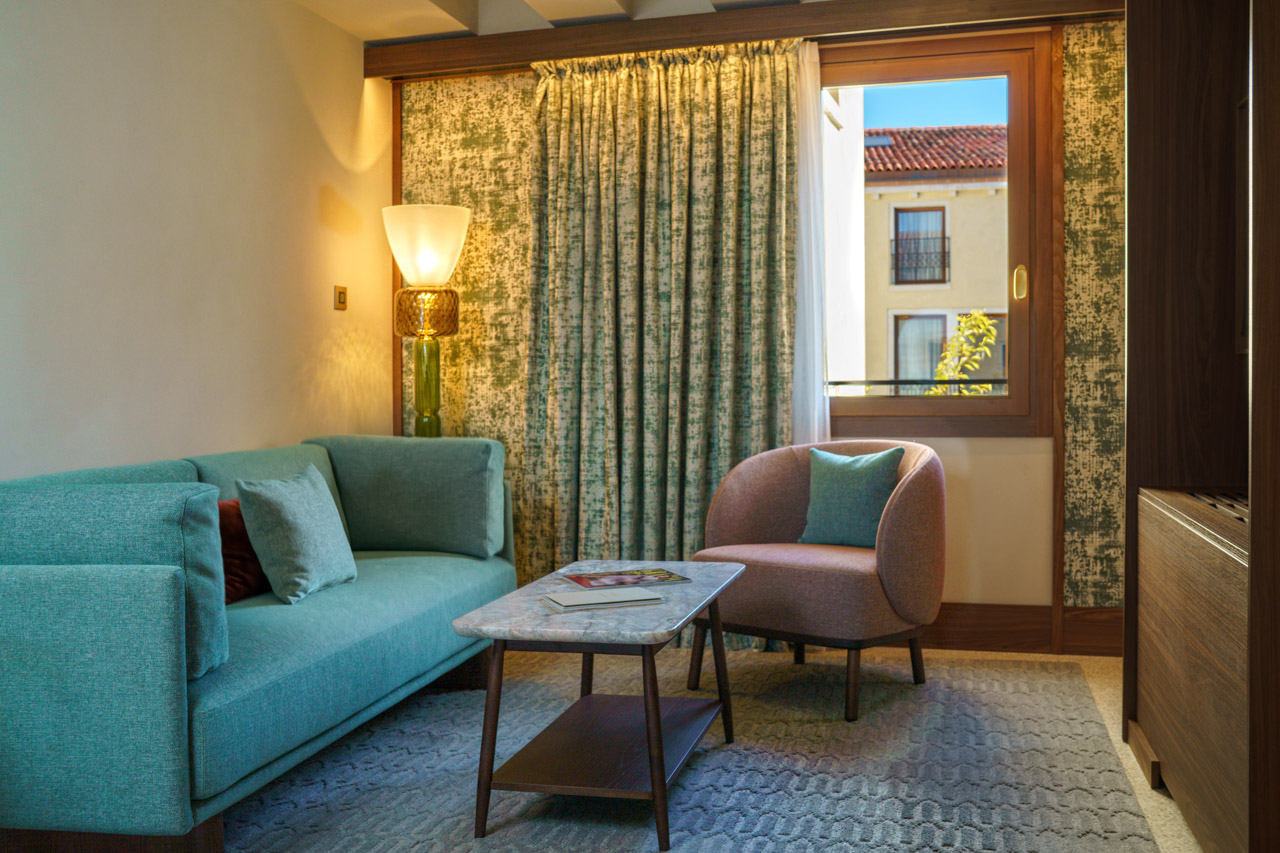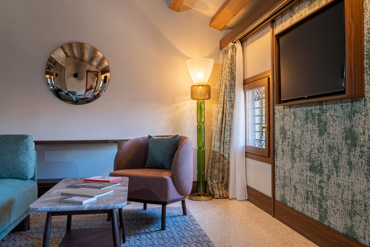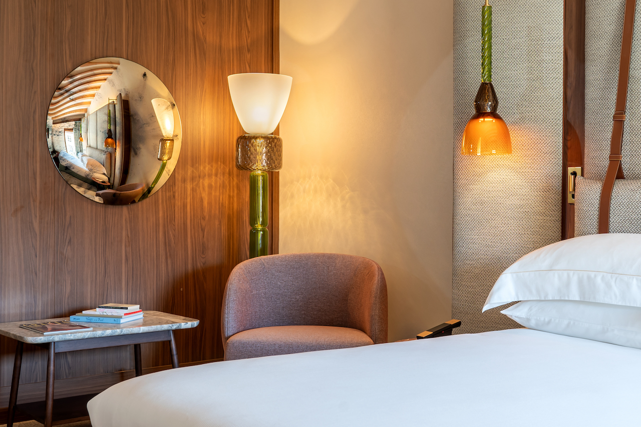 Der Möbelhersteller Molteni&C stattete die Innenräume der 66 Zimmer mit maßgefertigten Stücken aus, die von Patricia Urquiola entworfen wurden. Die Marke bereichert auch die Flure mit Holzdecken, Stoffpolstern und Bänken. Das Ambiente wird durch ikonische Stücke der verschiedenen Molteni&C-Kollektionen vervollständigt, wie die von Rodolfo Dordoni entworfenen Filigree-Tische und die von Francesco Meda entworfenen Woody-Stühle.
