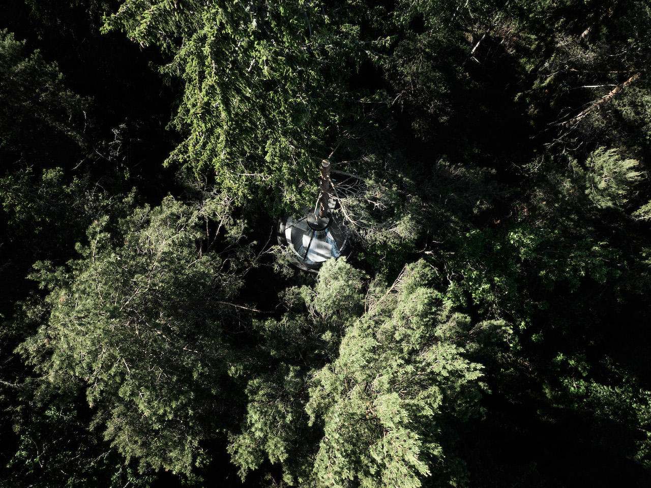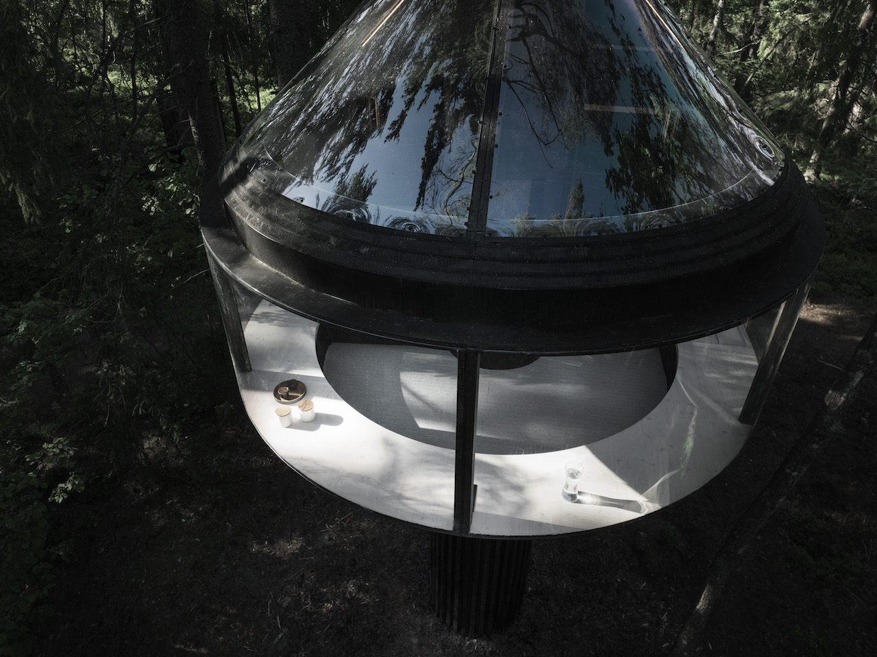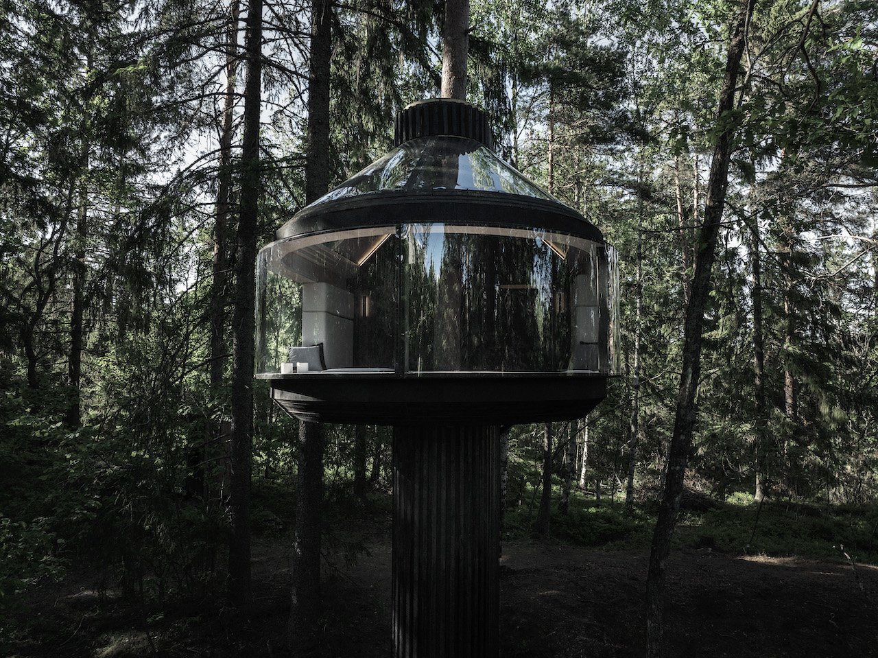 Das vom finnischen Designer Kristian Talvitie entworfene Baumhaus definiert das Konzept des „Reisens“ neu. Direkt unter der Baumkrone montiert, schwebt die Konstruktion im Wald und bietet durch ihre großzügige Panoramaverglasung einen ungehinderten Blick in das Blätterdach.