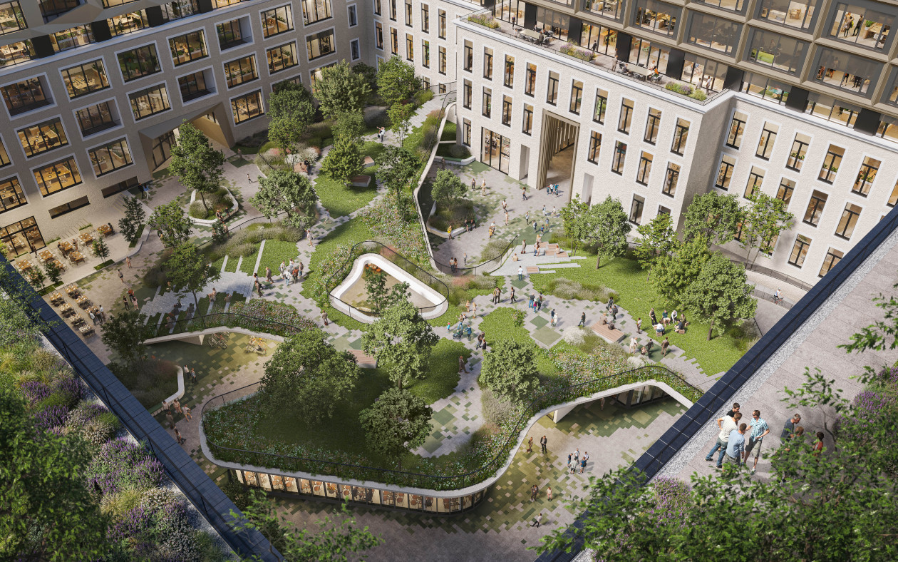 Eine Hauptrolle spielen dabei die umbauten Höfe. Ansprechend bepflanzt und strukturiert, sollen sie Teil einer großzügigen Grünlandschaft werden, die die Zusammenkunft der Nachbarschaft ermöglichen und die Attraktivität des Gesamtgeländes erhöhen soll. Als gemeinsames Gestaltungselement fungieren unter anderem gefaltete Aluminiumelemente, die einladend auf hohe Ein- und Durchgänge hinlenken. Insgesamt soll auf 26.365 Quadratmetern Hauptnutzfläche ein Ort "des gemeinsamen Arbeitens, Lernens und Produzierens" entstehen, "eine neue Art urbaner Stadtlandschaft" und "Gemeinschaft mit multipler Identität", der als Eingangstor zum Werkviertels dienen soll.