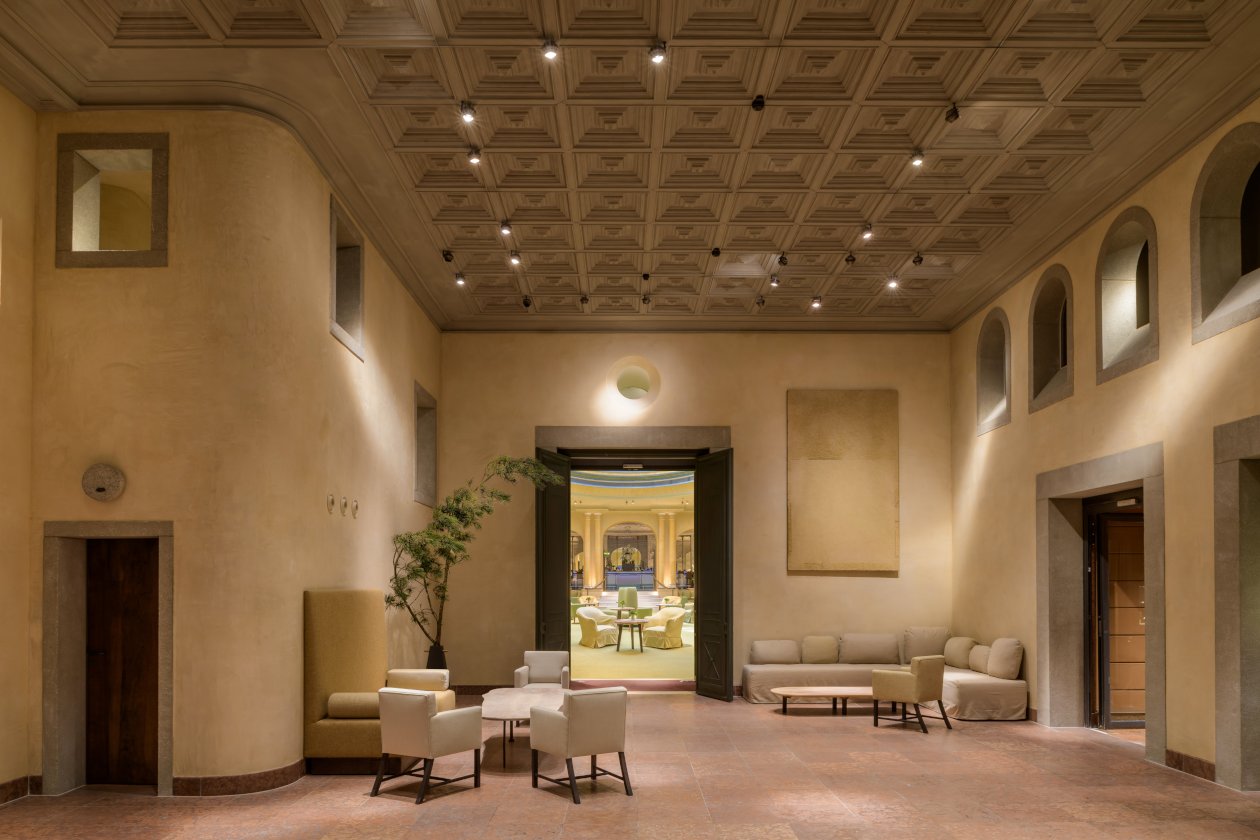 Diese Handschrift ist auch in der neuen Lobby omnipräsent, die Vervoordt als verbindendes Element für die unterschiedlichen Welten des Hotels konzipiert hat. Für ausgewogene Proportionen und eine klare räumliche Ordnung sorgte der Rückbau der umschließende Balustrade und Ersatz durch neue, nicht tragende Wände. Der vorhandene Natursteinboden blieb bewusst erhalten, ergänzende Arbeiten wurden mit demselben Stein „Ungarisch Rot" realisiert. Nach oben schließt eine eingefügte Kassettendecke den Raum ab, der Gästen ein Gefühl von Höhe, Großzügigkeit und Ruhe vermitteln soll. Für die Wandflächen wählte Axel Vervoordt eine klassische Lehmputzvariante, die auf alten handwerklichen Methoden basiert, für die Rezeption Nussbaumholz und natürlich gegerbtes und gefärbtes Leder, als Hauptkunstwerk rechts vom Eingang zum Atrium ein Bild des 2011 verstorbenen koreanischen Künstlers Chung Chang-Sup. Es bringt für Vervoordt den koreanischen Sumbi-Geist als harmonische Verbindung von Intelligenz, Stärke und stiller Präsenz zum Ausdruck.