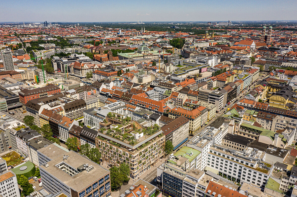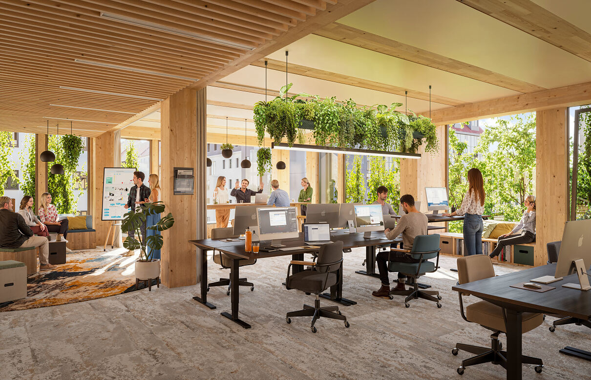 Nahe des Münchner Hauptbahnhofs wird The Stack fertiggestellt: das erste Holz-Hybrid-Bürogebäude im Central Business District. Highlight ist viel Grün im Inneren und außen. Fast ein Drittel der Fläche bezieht Mitte 2026 Novartis als Mieter.