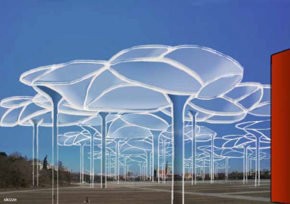 Die Aufhängung erfolgt über das gleichmäßige Stützenraster, welches sich in filigraner Konstruktion auf die Theresienwiese erstreckt. Die Zugänglichkeit erschließt sich über den Service Tower, der gleichzeitig als Multimedia Zentrum dient.