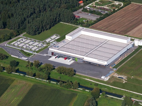 Mühlhausen bei Neumarkt | Die Fassade der neuen Logistikhalle kennzeichnen anthrazitfarbene Stahlbeton-Sandwichelemente mit weißen Stahlblech-Isopaneelen...
